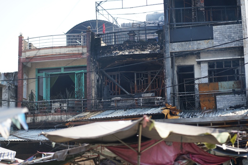 Ghi nhận tại hiện trường cho thấy nhiều căn nhà trong dãy bị cháy chỉ còn trơ lại khung sắt, mái tôn cong vênh, cháy đen sau vụ hỏa hoạn. Bên trong, toàn bộ hàng hóa, vật dụng sinh hoạt bị thiêu rụi, ngổn ngang tro tàn, mùi khét vẫn còn nồng nặc.