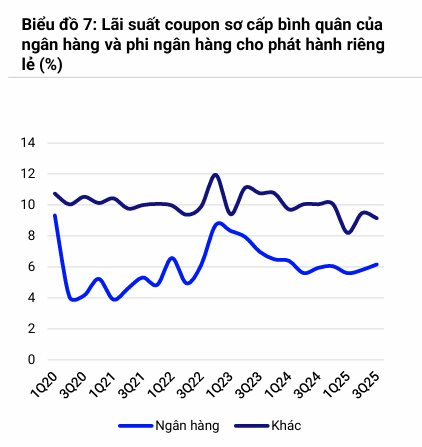Trái ngược với xu hướng trên, chi phí huy động vốn của nhóm ngân hàng lại đang tăng. Báo cáo S&I cho thấy lãi suất coupon bình quân của nhóm này trong Quý 3 đã tăng lên 6,18%, mức cao nhất trong 6 quý. Diễn biến này được cho là do nhu cầu huy động vốn của các nhà băng tăng lên để đáp ứng tăng trưởng tín dụng, vốn đã đạt 13,37% vào cuối tháng 9/2025 (theo số liệu VBMA).
