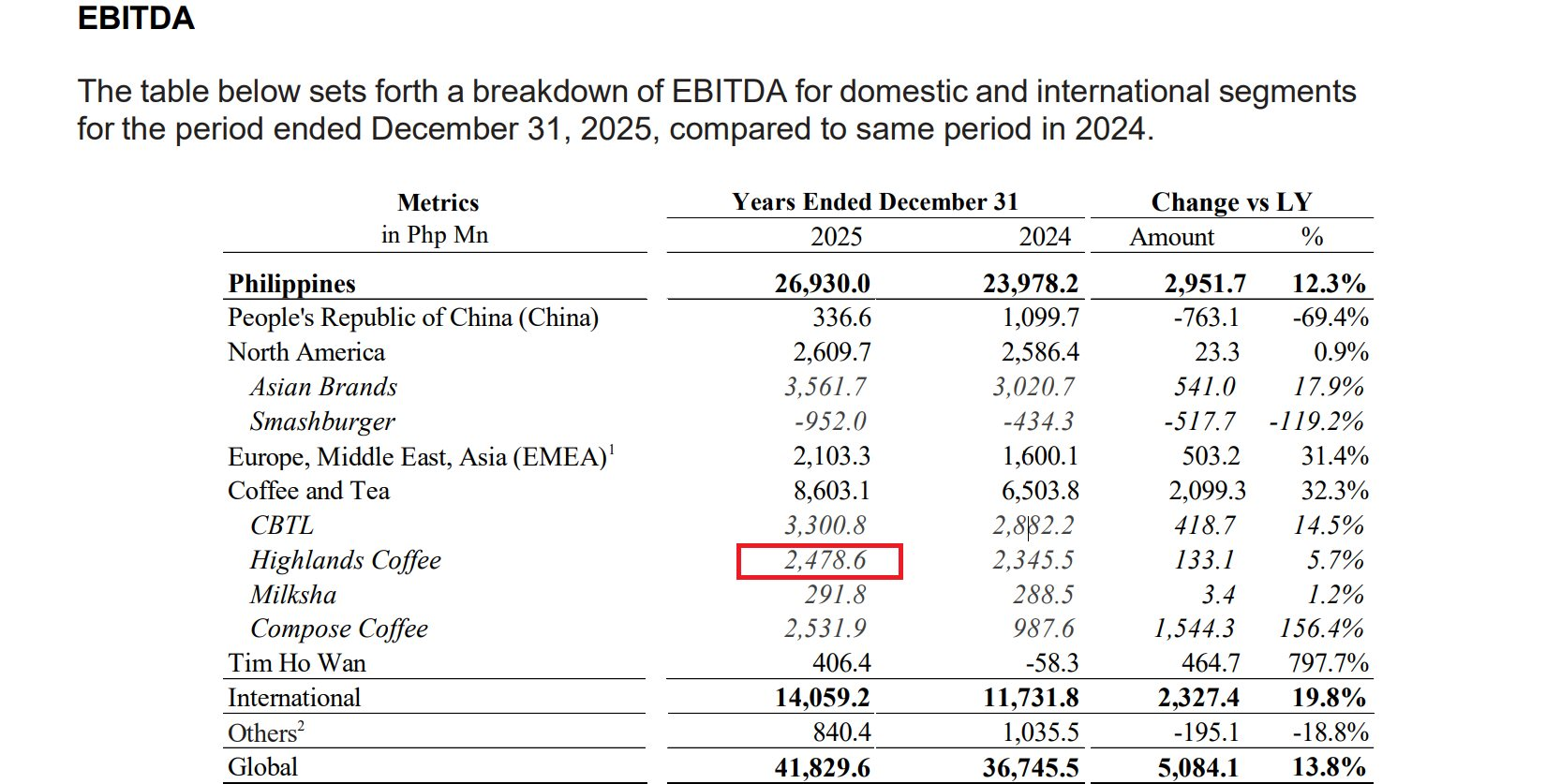 Năm 2023 là năm đầu tiên Jollibee công bố số liệu của riêng Highlands Coffee trong báo cáo. Từ đó, lợi nhuận EBITDA của Highlands Coffee đã tăng 5,7% trong năm 2025 và 4,5% trong năm 2024.