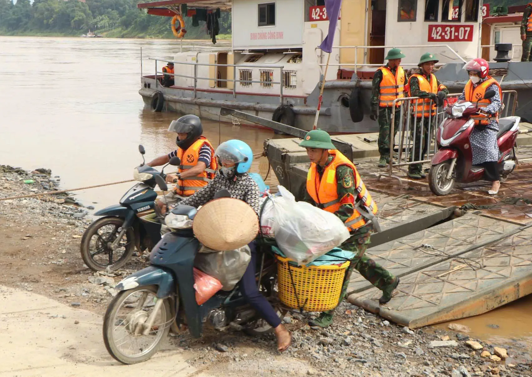 Hai đầu bên Lữ đoàn Công binh 249 bố trí bộ đội giúp người dân lên xuống phà an toàn.