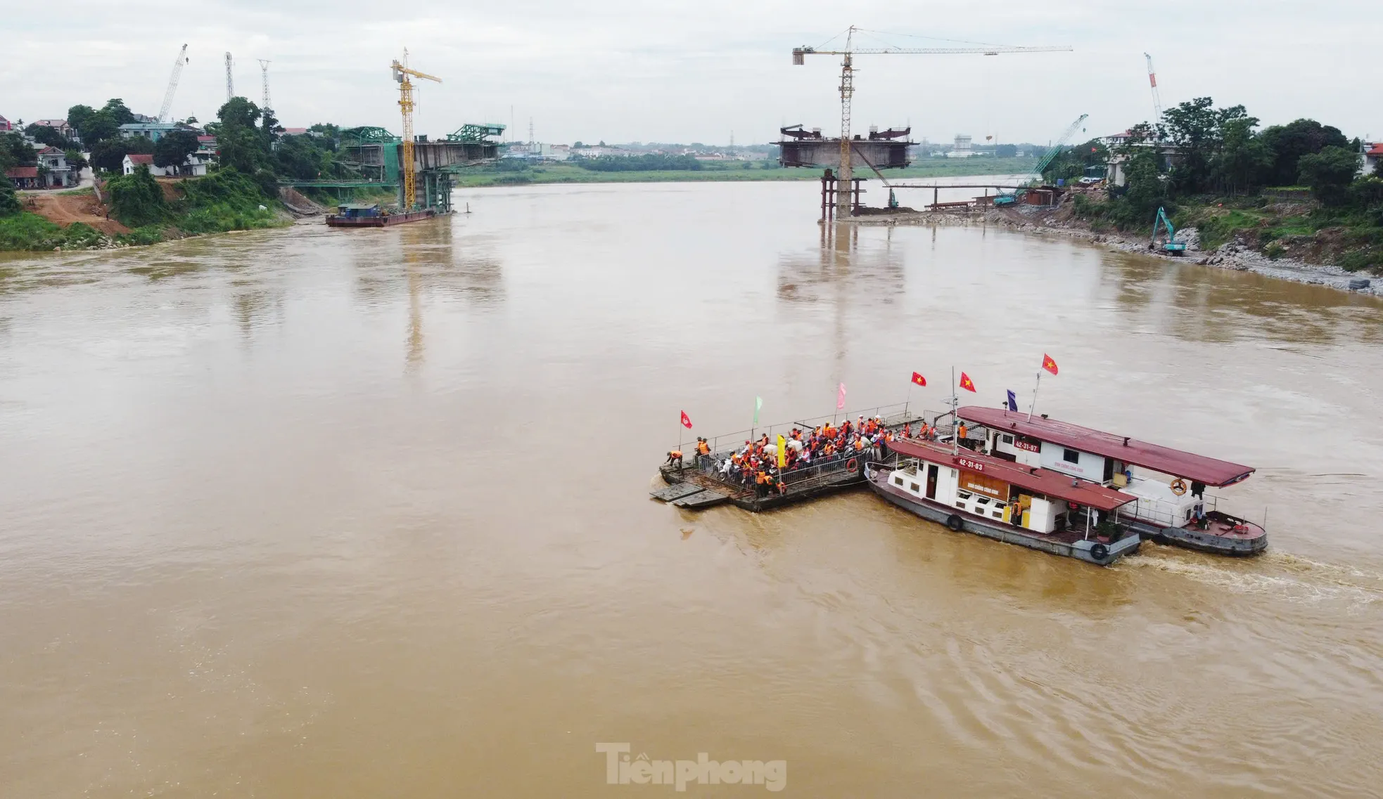 Phà quân sự bắt đầu khởi hành đưa người dân qua sông Hồng.
