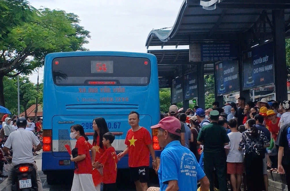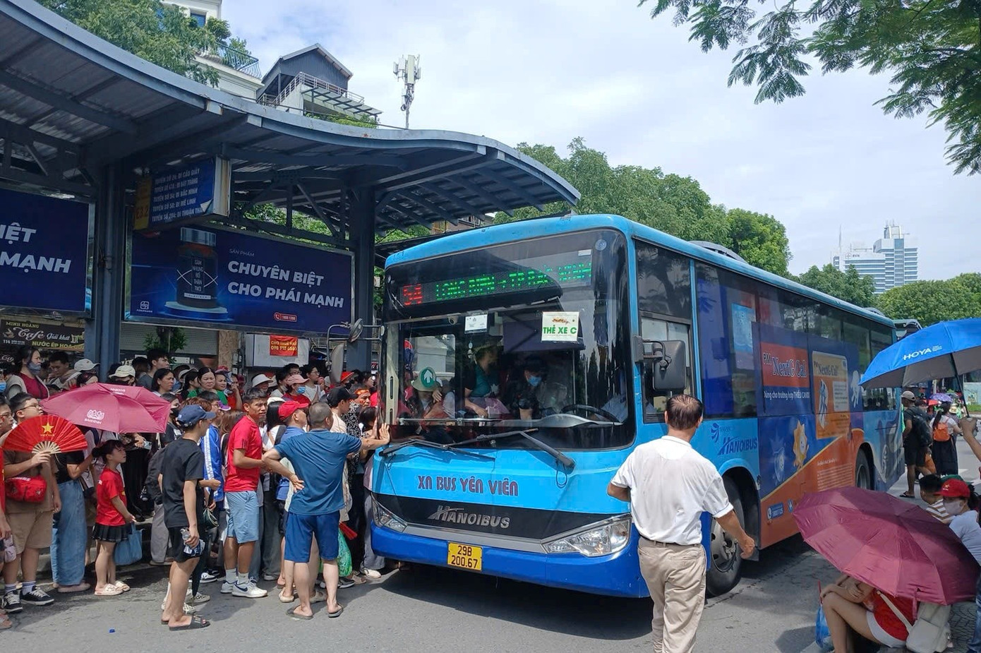 Trên một số điểm trung chuyển sáng và trưa 30/8, nhiều lượt xe đến không chở hết được hành khách đứng đợi. Đây là hình ảnh "cháy xe buýt" hiếm gặp của vận tải công cộng Hà Nội trong nhiều năm qua.