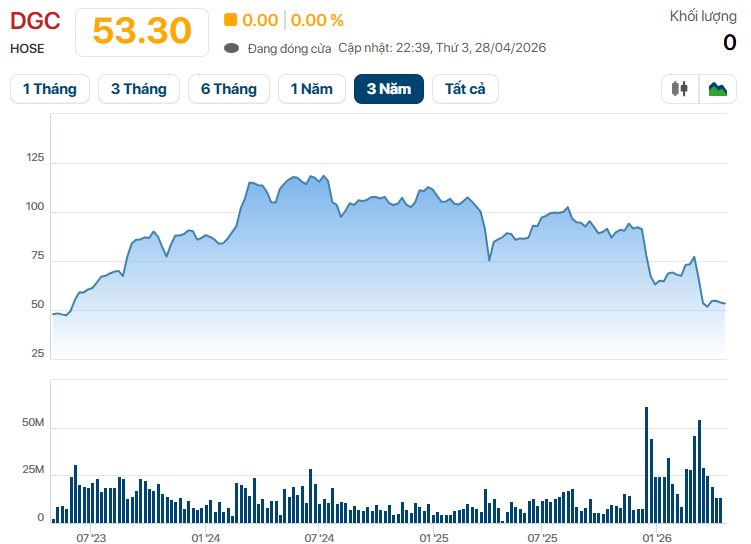 Trên thị trường, chốt phiên 28/4, thị giá DGC đạt 53.300 đồng/cp, vốn hóa tương ứng đạt 20.242 tỷ đồng.