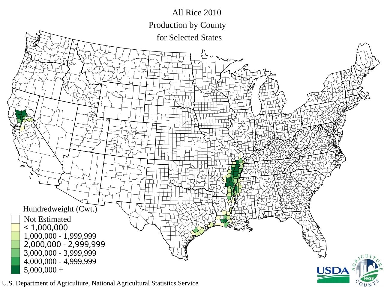Ngành sản xuất lúa gạo của Hoa Kỳ hiện tập trung chủ yếu tại sáu bang trọng điểm bao gồm Arkansas, Mississippi, Missouri, Louisiana, Texas và California.