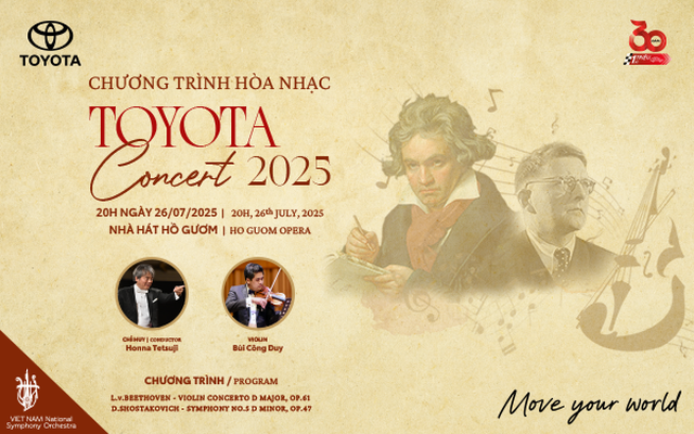 Đặc biệt, nhân dịp đánh dấu cột mốc 30 năm phát triển bền vững của Toyota tại Việt Nam, Hòa nhạc Toyota 2025 sẽ mang đến các tác phẩm kinh điển của những nhà soạn nhạc vĩ đại: Concerto Violin Re Trưởng, Op. 61 của Ludwig van Beethoven và Giao Hưởng Số 5 Re Thứ, Op. 47 của Dmitri Shostakovich, được thể hiện bởi Dàn nhạc Giao hưởng Việt Nam (VNSO) dưới sự chỉ huy của nhạc trưởng tài năng Honna Tetsuji cùng phần trình diễn độc tấu của nghệ sĩ violin Bùi Công Duy, hứa hẹn mang đến một đêm đắm chìm trong những giai điệu mượt mà, quyến rũ cho những tâm hồn yêu nhạc cổ điển.