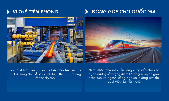 Tháng 5/2025, Tập đoàn Hòa Phát đã ký kết hợp đồng với đối tác SMS Group (Đức) về việc cung cấp công nghệ và dây chuyền sản xuất thép ray, thép hình. SMS Group thiết kế, cung cấp, lắp đặt dây chuyền sản xuất thép ray và thép đặc biệt cho Hòa Phát. Dây chuyền gồm các thiết bị chính như: Lò nung phôi, giá cán thô, giá cán đảo chiều đa năng; Hệ thống quét laser phát hiện lỗi bề mặt và biên dạng sản phẩm tự động; Hệ thống kiểm soát chất lượng thép dạng không phá hủy (NDT); Hệ thống tôi đầu ray và khoan lỗ ray đồng bộ. Toàn bộ thiết bị chính được sản xuất tại Đức với hệ thống kiểm soát chất lượng nghiêm ngặt và đồng bộ, đảm bảo đạt yêu cầu để sản xuất ray phục vụ cho các loại đường sắt tốc độ cao ở Việt Nam và trên thế giới.