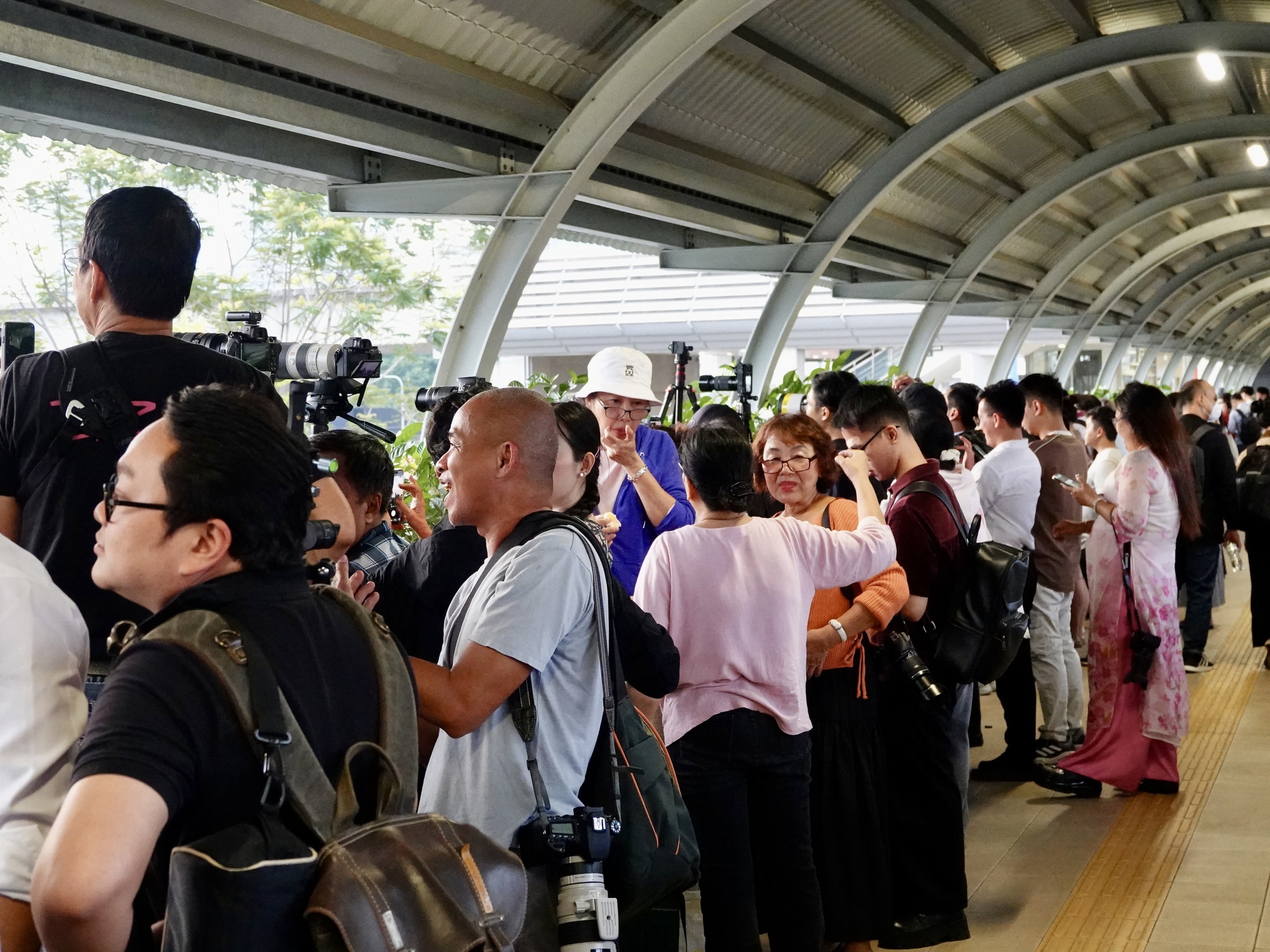 Chiều ngày 24/2 (tức ngày mùng 8 Tết Bính Ngọ) khu vực chân cầu Sài Gòn và cầu đi bộ tại ga Metro Thảo Điền (TP.HCM) tiếp tục đông nghịt người dân, nhiếp ảnh gia và các bạn trẻ tập trung chờ săn khoảnh khắc mặt trời lặn trùng nhịp cầu.