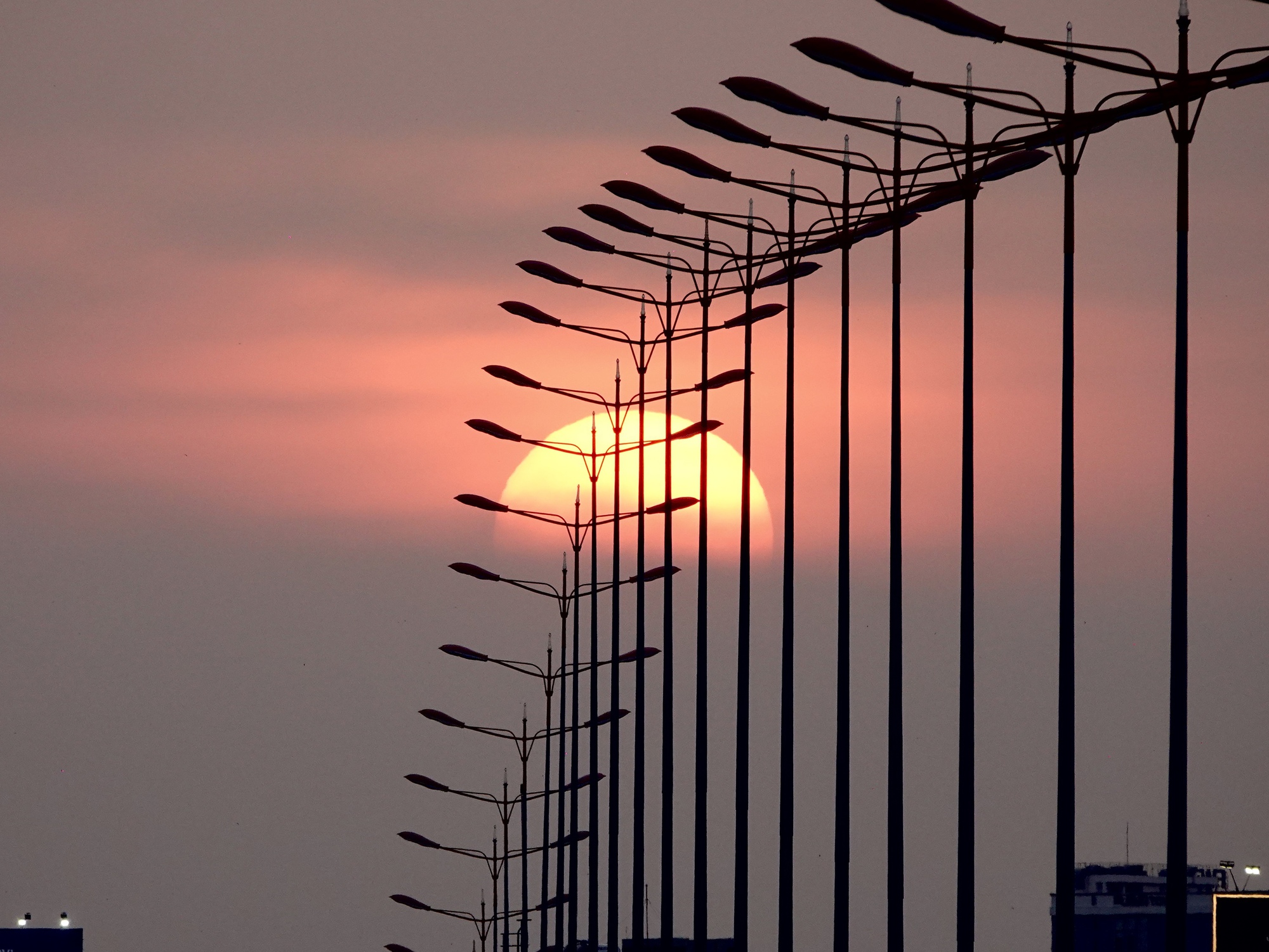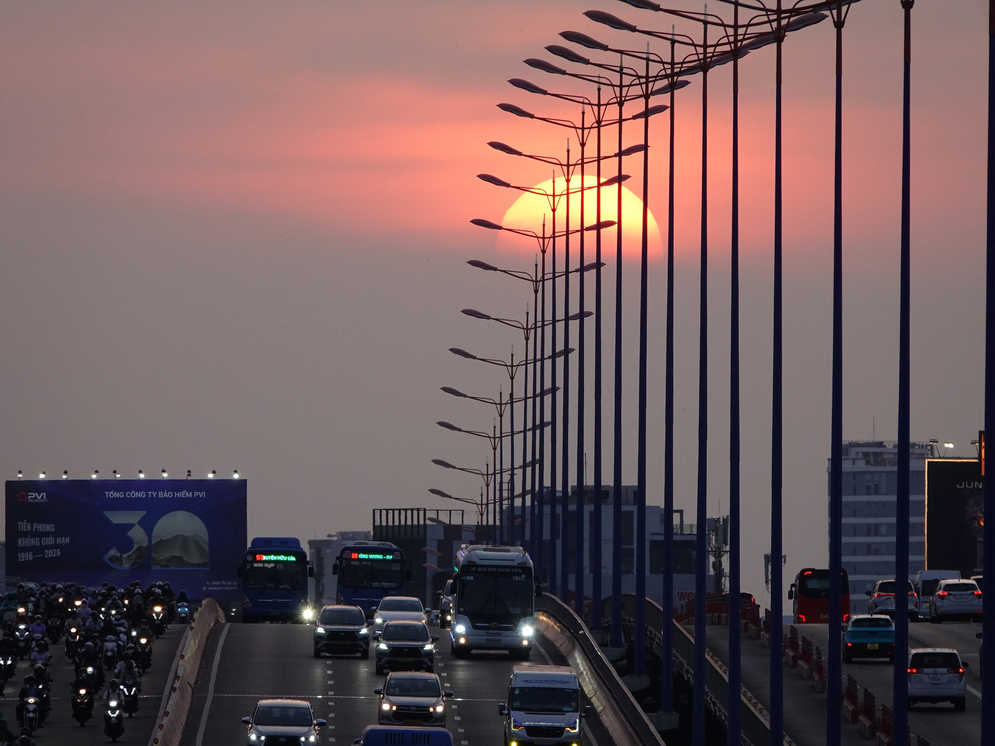 Tuy nhiên, phải đến khoảng 18h, mặt trời mới bắt đầu chuyển sang sắc đỏ đậm và hiện rõ hình tròn trịa phía sau nhịp cầu