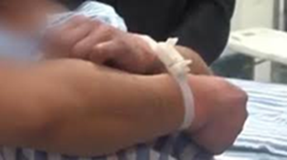 Khi nhập viện, bệnh nhân có biểu hiện kích động dữ dội, buộc phải cố định tay chân để đảm bảo an toàn trong quá trình chăm sóc.