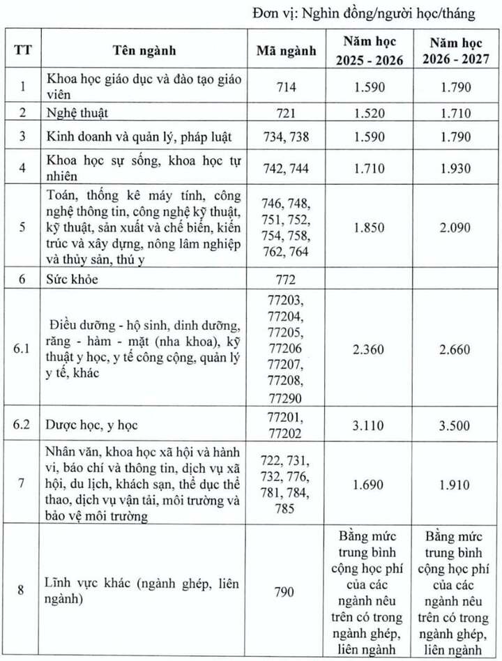 Đối với trường đại học tự bảo đảm chi thường xuyên và chi đầu tư, mức học phí được xác định tối đa bằng 2,5 lần mức trần trên, tương ứng với từng khối ngành và từng năm học.