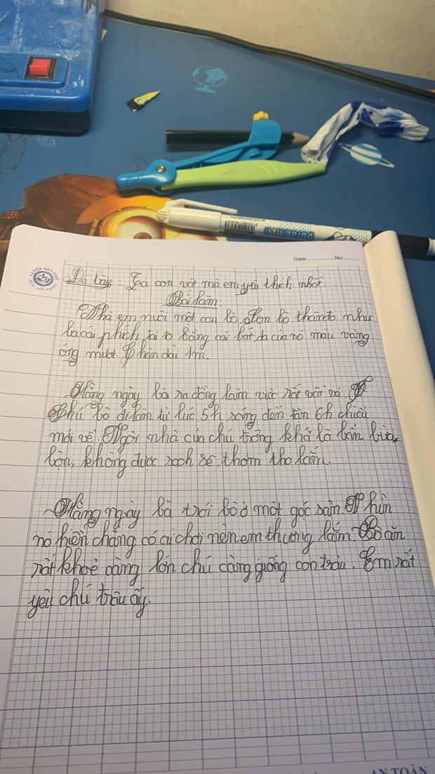 “Nhà em nuôi 1 con bò. Con bò thân to như 3 cái phích, tai to bằng cái bát, da của nó màu vàng óng mượt. Chân dài 1m”. Những hình ảnh so sánh như “thân to như 3 cái phích” hay “tai to bằng cái bát” khiến nhiều người đọc phải bật cười vì quá… cụ thể và mộc mạc. Dù có phần ngây ngô, nhưng cách miêu tả này lại cho thấy khả năng quan sát rất rõ ràng của trẻ nhỏ. Với các em, mọi thứ đều được hình dung thông qua những vật dụng quen thuộc trong đời sống hằng ngày.