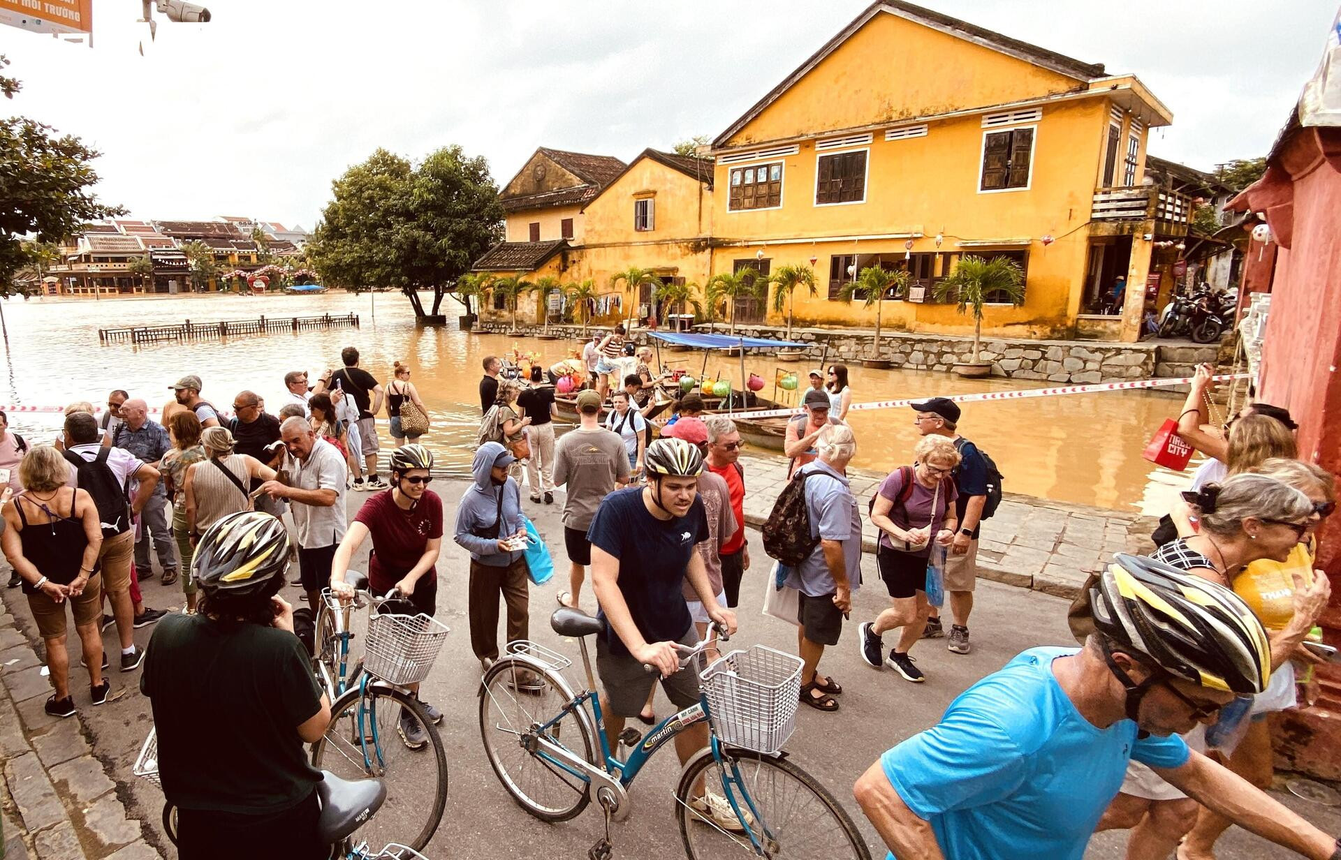 Chỉ trong vòng 20 ngày, Hội An hứng 3 trận ngập lụt; giữa biển nước mênh mông, du khách thích thú ngồi thuyền ngắm phố.