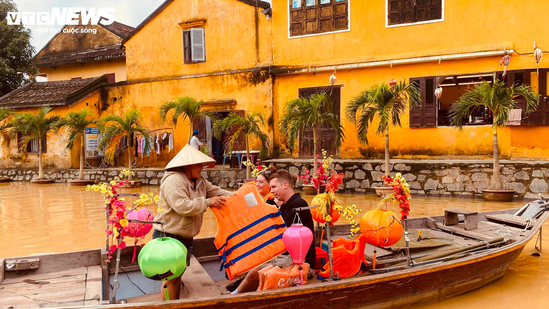 Cũng trong ngày Hội An hứng lụt, nhiều du khách thích thú ngồi thuyền tham quan phố cổ.