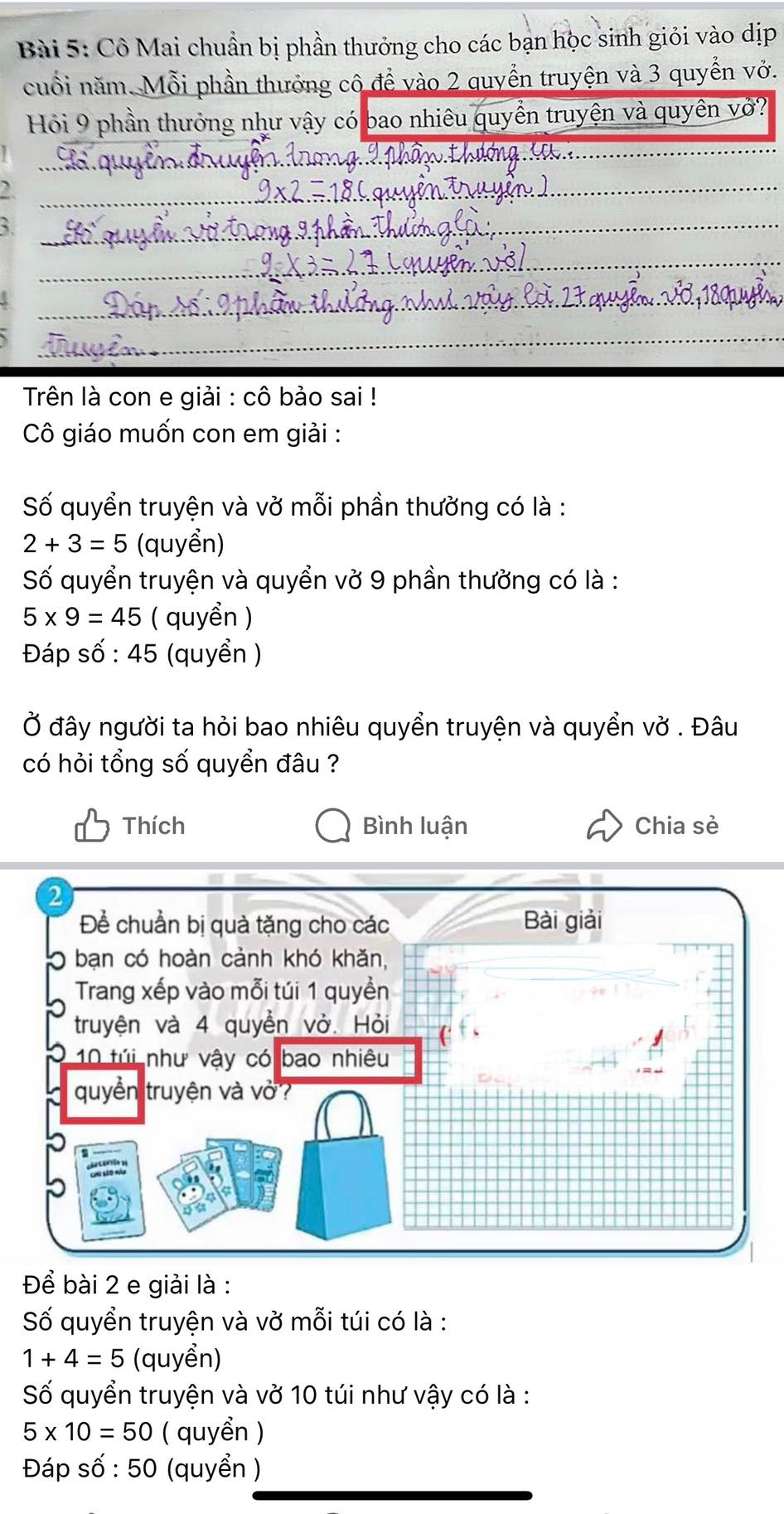 "Nếu đề muốn kiểm tra biểu thức, cần viết: 'Hỏi 9 phần thưởng có tất cả bao nhiêu quyển truyện và vở?'. Còn nếu chỉ hỏi từng loại, nên ghi rõ: 'Có bao nhiêu quyển truyện? Bao nhiêu quyển vở?'. Trẻ lớp 3 không thể tự phân biệt ý ngữ pháp mơ hồ như người lớn", một người góp ý.