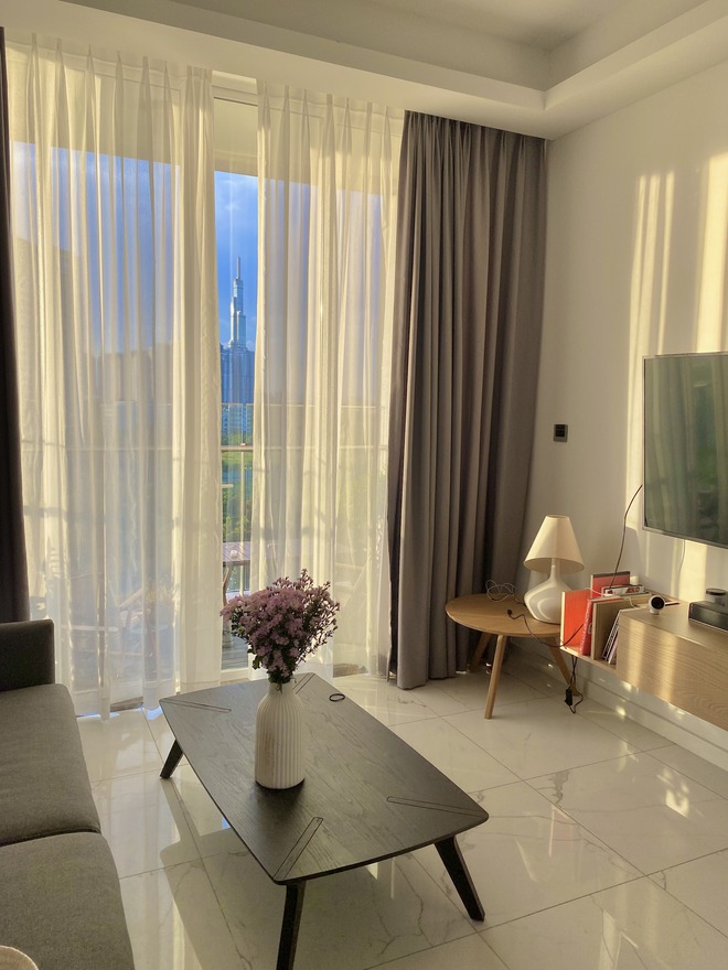 Thùy Linh (25 tuổi) thuê căn hộ 95m2 tại TP Hồ Chí Minh cùng bạn trai. Được biết riêng tiền thuê nhà là 23 triệu đồng/ tháng, phí dịch vụ 1,3 triệu đồng đã được giảm 50%, trung bình điện nước mỗi tháng 2,5 - 3 triệu đồng.