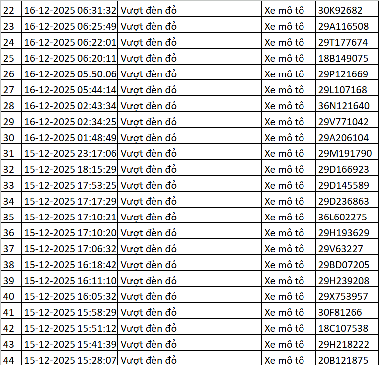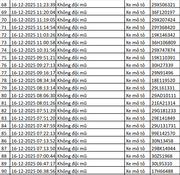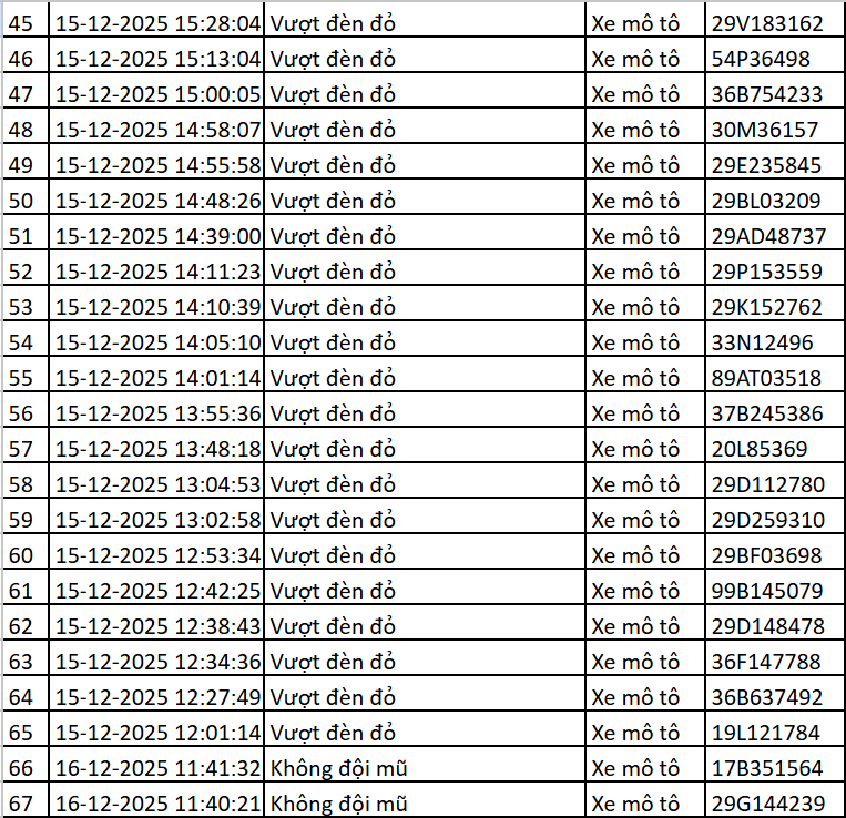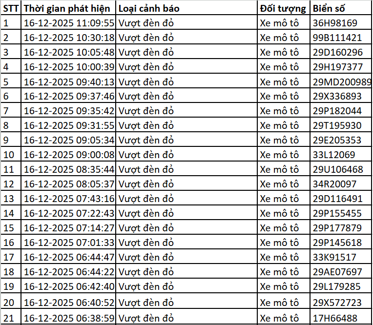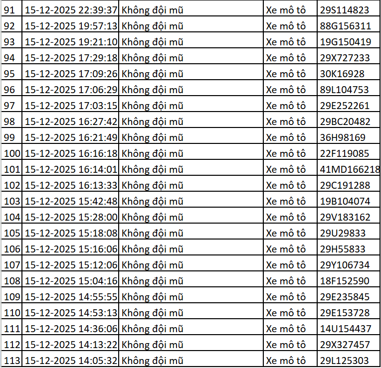 Mới đây, Cục Cảnh sát Giao thông đã thông báo danh sách 119 trường hợp vi phạm trật tự, an toàn giao thông được phát hiện qua camera AI trong ngày 15/12 và ngày 16/12. Hai lỗi vi phạm chủ yếu trong danh sách là xe mô tô vượt đèn đỏ và không đội mũ bảo hiểm tại nội đô Hà Nội.