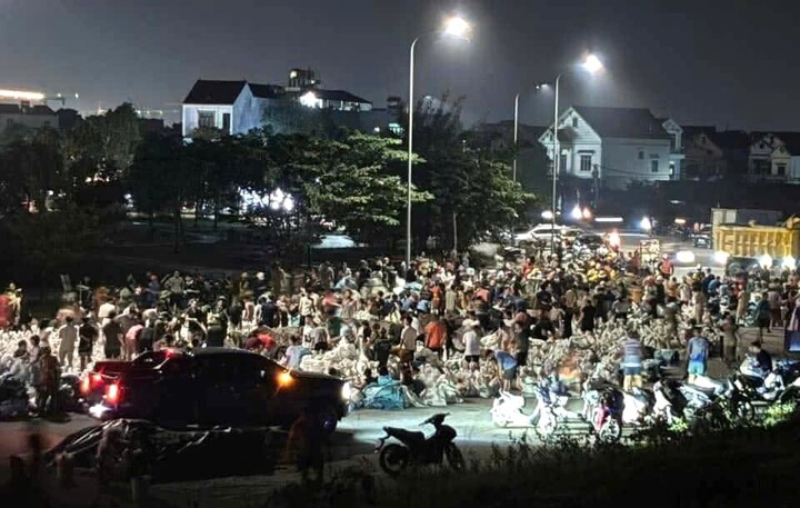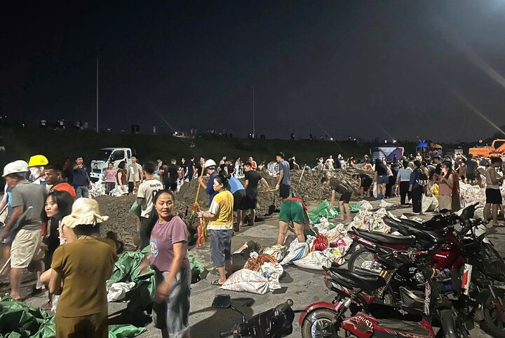 Không chỉ người dân địa phương, nhiều hộ ở các xã lân cận như Văn Môn, Yên Phong cũng tình nguyện kéo về Tam Giang hỗ trợ. Họ mang theo nước uống, bánh mỳ để phục vụ lực lượng làm nhiệm vụ trên đê. Dưới ánh đèn pin và đèn pha của xe máy, dòng người nối dài chuyền tay nhau từng bao cát, từng xẻng đất, vừa làm vừa động viên nhau giữ vững tinh thần.