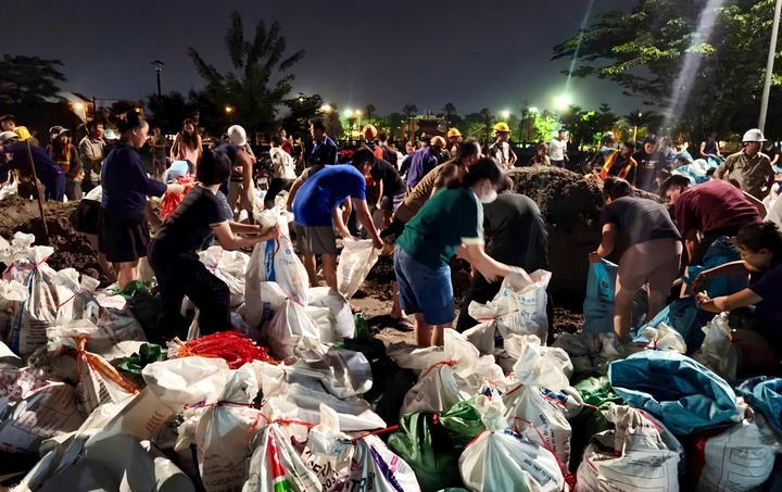 Từ người già đến thanh niên, ai nấy đều khẩn trương. Những bao cát được chuyền tay nhau liên tục, tiếng động cơ máy xúc hòa cùng tiếng hò của hàng nghìn người.