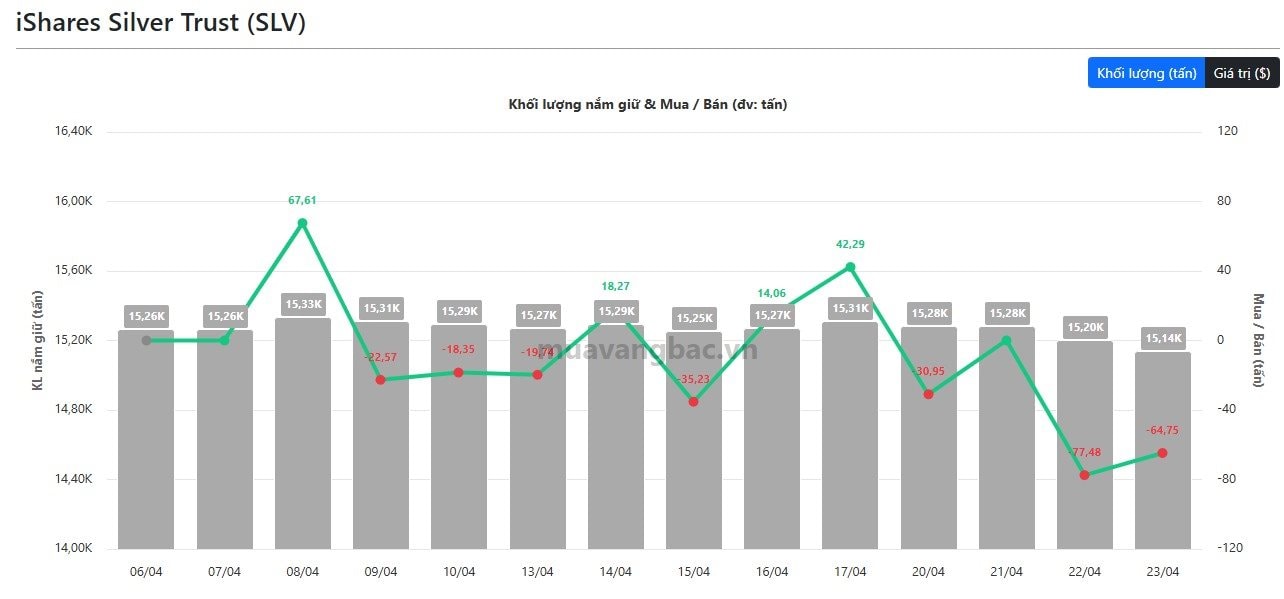 Theo cập nhật mới nhất, quỹ bạc lớn nhất thế giới iShares Silver Trust (SLV) do BlackRock quản lý đã bán ra hơn 65 tấn bạc trong phiên 24/4, nâng tổng lượng bán ròng sau hai phiên lên 142 tấn. Hiện quỹ này còn nắm giữ khoảng 15.140 tấn bạc, tương đương quy mô gần 42 tỷ USD.