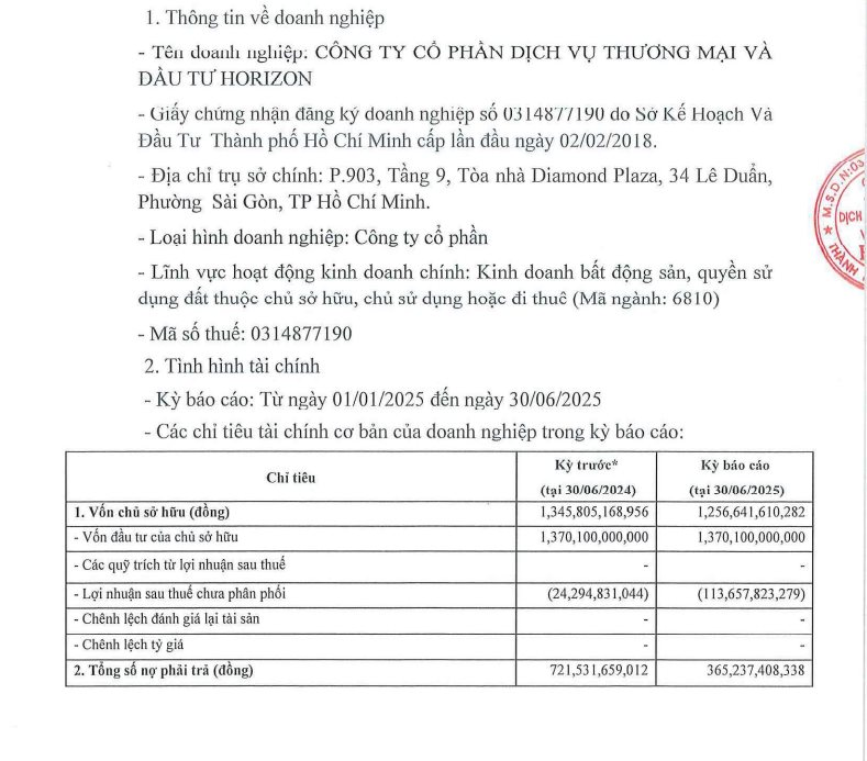 Về sức khỏe tài chính, tính đến thời điểm 30/6/2025, vốn chủ sở hữu của Horizon giảm 6,6% so với hồi cùng kỳ, xuống 1.256 tỷ đồng. Trong đó, vốn đầu tư của chủ sở hữu là 1.370 tỷ đồng và lợi nhuận sau thuế chua phân phối là âm 113,6 tỷ đồng.