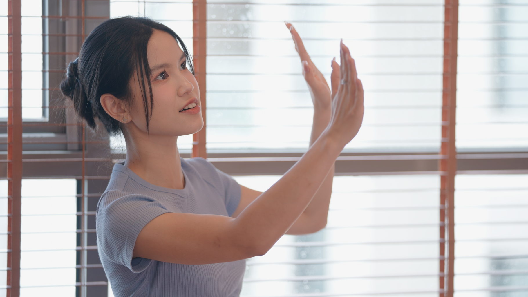 Không dừng lại ở đó, góc phòng ngủ của Tizi Đích Lép còn gây ấn tượng bởi khoảng kính được thiết kế rất rộng, có thể nhìn thông sang phòng khách và sử dụng rèm sáo nhôm để vẫn giữ được không gian riêng tư.