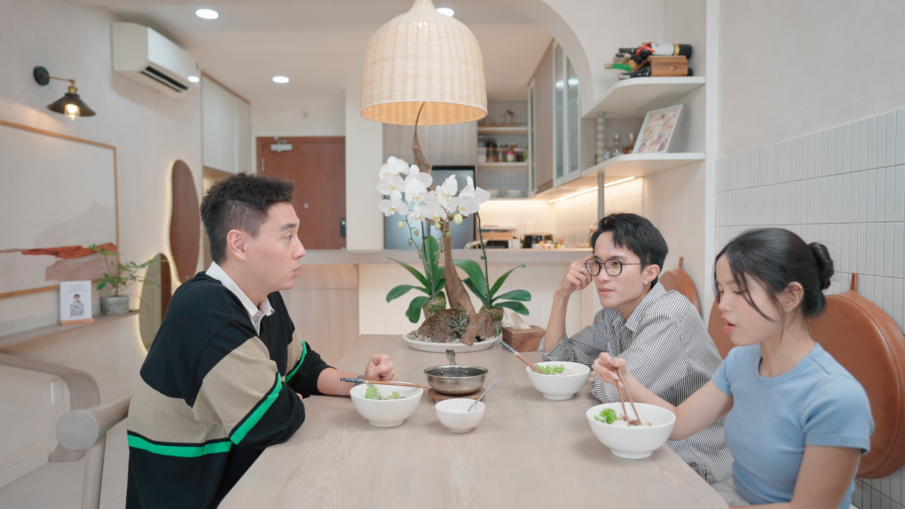 Chia sẻ với Host Kiên Hoàng - một ông bố vô cùng "yêu bếp nghiện nhà", một nhà sáng tạo nội dung nổi bật về phong cách sống, Tizi cho biết căn hộ 2 vợ chồng đang ở rộng 92m2 nhưng có tới 5 thành viên, bao gồm: Tizi Đích Lép và "3 đứa con": Nấm, Sin, Bối, giống chó shiba ba màu.