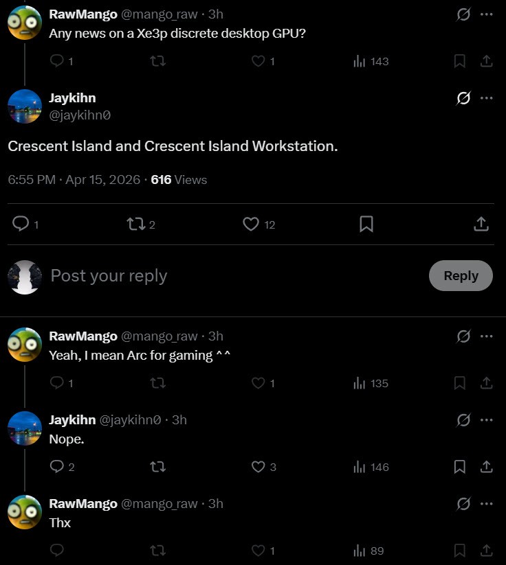 Theo thông tin từ người trong ngành Jaykihn, kiến trúc GPU Xe3P của Intel, thế hệ kế tiếp sau Xe3, sẽ có các sản phẩm card đồ họa rời mang thương hiệu Crescent Island. Tuy nhiên, danh sách sản phẩm hiện chỉ bao gồm hai phiên bản: một dành cho tính toán AI và một dành cho máy trạm chuyên nghiệp. Không có sản phẩm nào hướng đến game thủ.