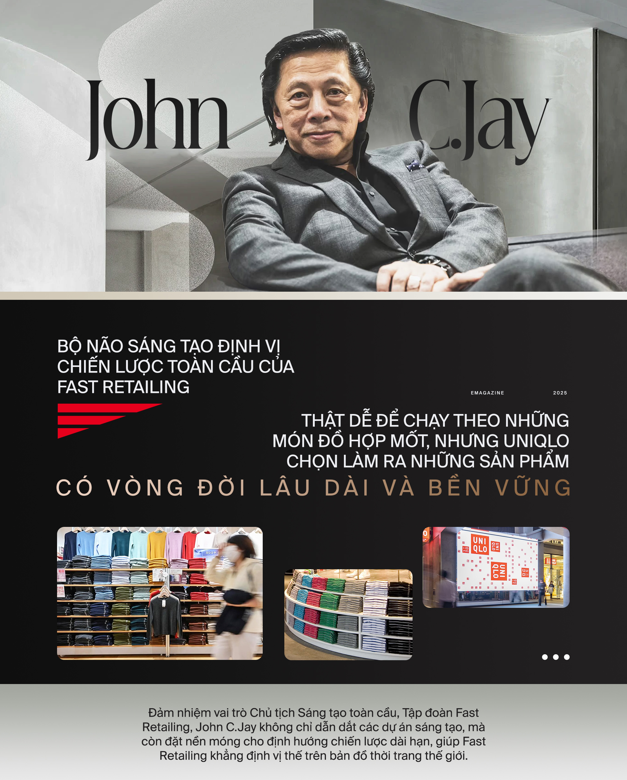 Trong thế giới thời trang, nơi tốc độ và xu hướng thường lấn át những giá trị lâu dài, Uniqlo lại chọn cho mình một con đường khác biệt: xây dựng “LifeWear” - khái niệm thời trang gắn liền với đời sống, đơn giản nhưng bền vững. Và đằng sau ngôn ngữ sáng tạo ấy là John C.Jay, Giám đốc Sáng tạo Toàn cầu của Fast Retailing - Công ty mẹ của thương hiệu thời trang Uniqlo, GU và Theory; cũng là nhà sản xuất và bán lẻ ngành hàng may mặc số 1 Nhật bản và thứ 3 thế giới (tính đến tháng 9/2025). Ông được xem như “kiến trúc sư hình ảnh” đã giúp thương hiệu Nhật Bản trở thành một hiện tượng văn hóa toàn cầu.