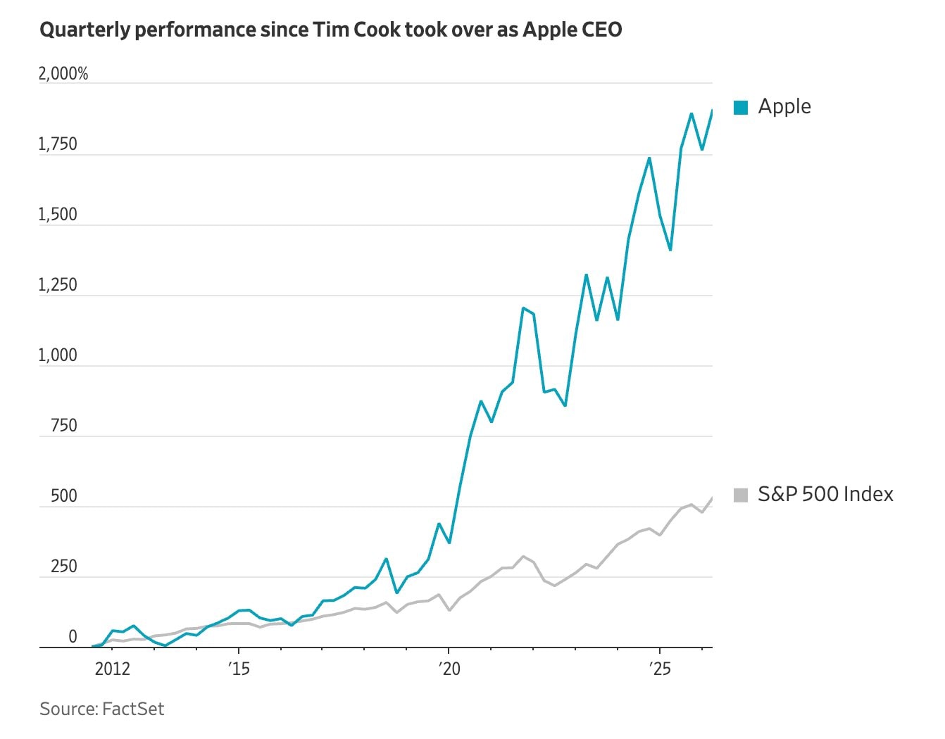 Tim Cook rời vị trí lãnh đạo cao nhất khi doanh thu của Apple đã tăng gấp bốn lần so với thời điểm ông tiếp quản.