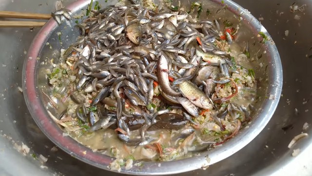 Khi những người bản địa đem món ăn ra, 2 vị khách nước ngoài không tránh khỏi sự ngạc nhiên. Có một chiếc chậu lớn, bên trong là rất nhiều chú cá vẫn còn sống đang bơi; một chiếc chậu lớn khác bên trong là các loại rau trộn như lõi chuối tươi, rau thơm (mùi, húng, thì là, kinh giới), cùng các gia vị cơ bản như mắm, muối, mì chính, tỏi, ớt, mắc khén ăn kèm. Tất cả phải được băm nhỏ tạo thành một hỗn hợp ăn kèm chua cay, nồng, ngọt và có mùi thơm đặc trưng.