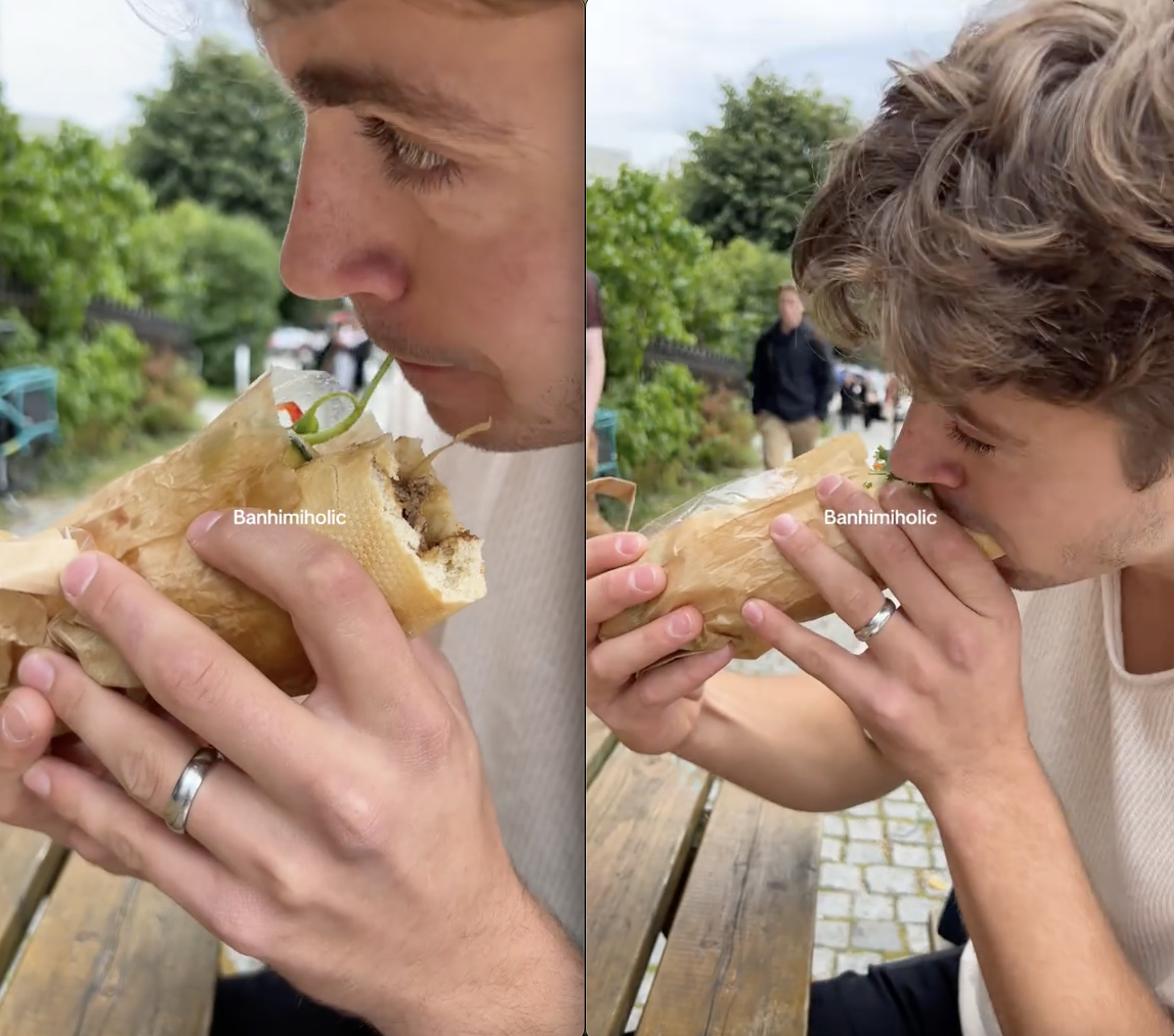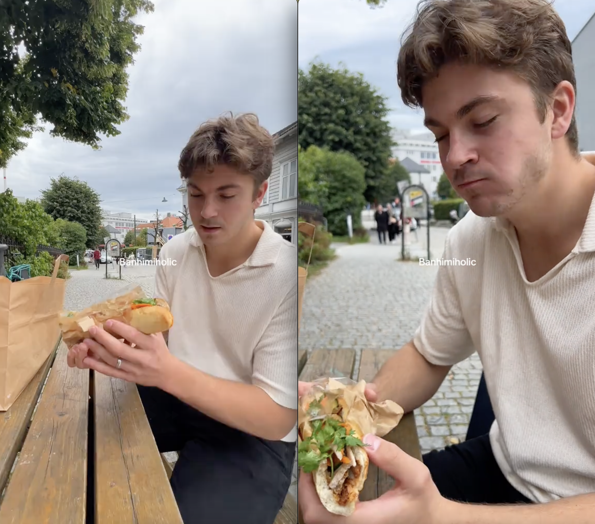 Trong đoạn clip lan truyền trên mạng, người đàn ông Tây ngồi bên chiếc bàn nhỏ ven đường, trước mặt là ổ bánh mì vàng ruộm. Anh cẩn thận cầm lên, cắn từng miếng nhỏ, mắt lim dim như để cảm nhận trọn vẹn hương vị. Đặc biệt, khi một cọng rau mùi như sắp rơi ra khỏi chiếc bánh, anh không hề bỏ qua mà nhanh chóng đưa lên miệng thưởng thức một cách trân trọng.