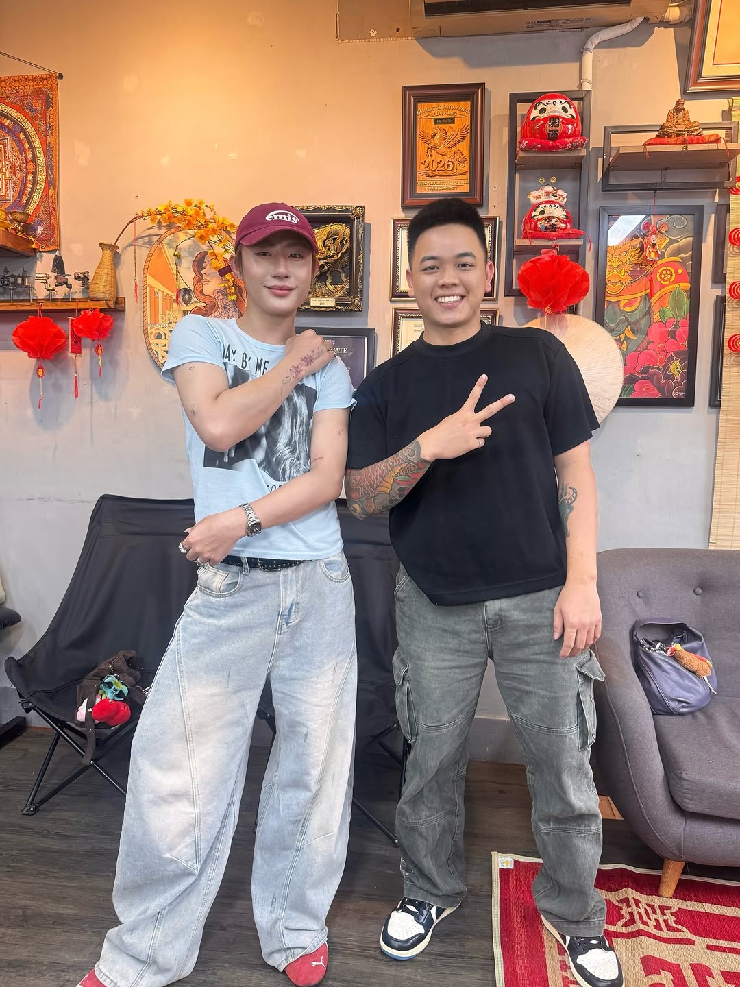 Hình ảnh nam du khách chụp ảnh cùng người đã xăm hình cho mình. Ảnh: @foofoamm.m