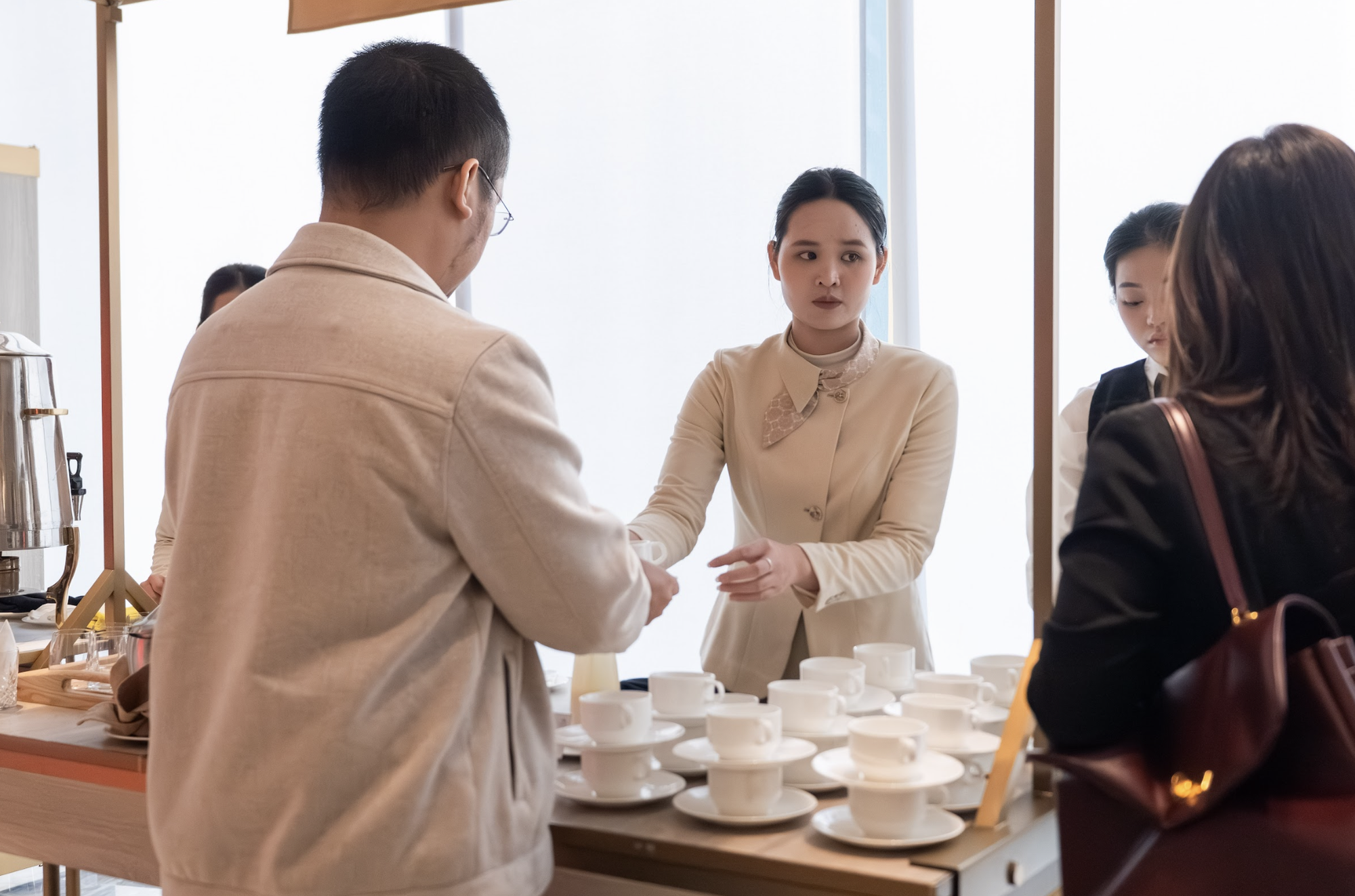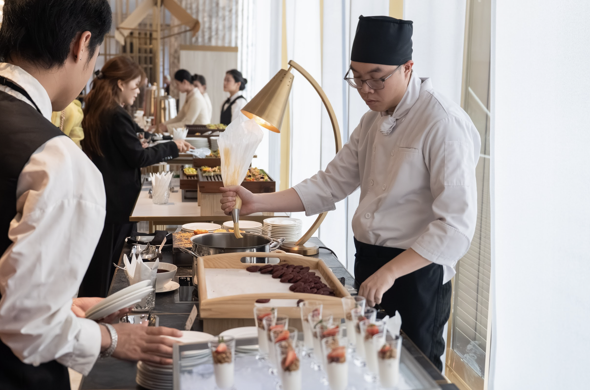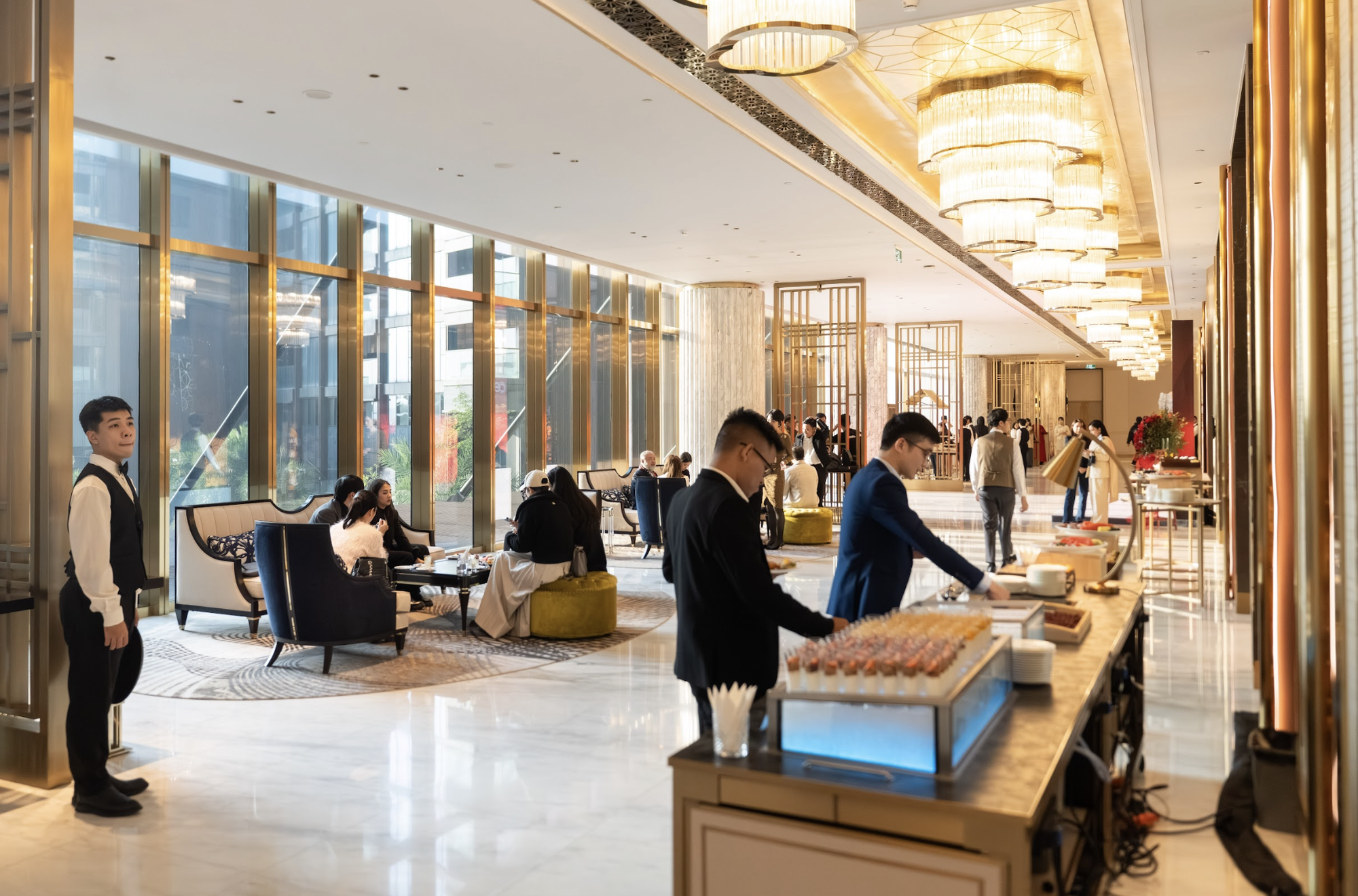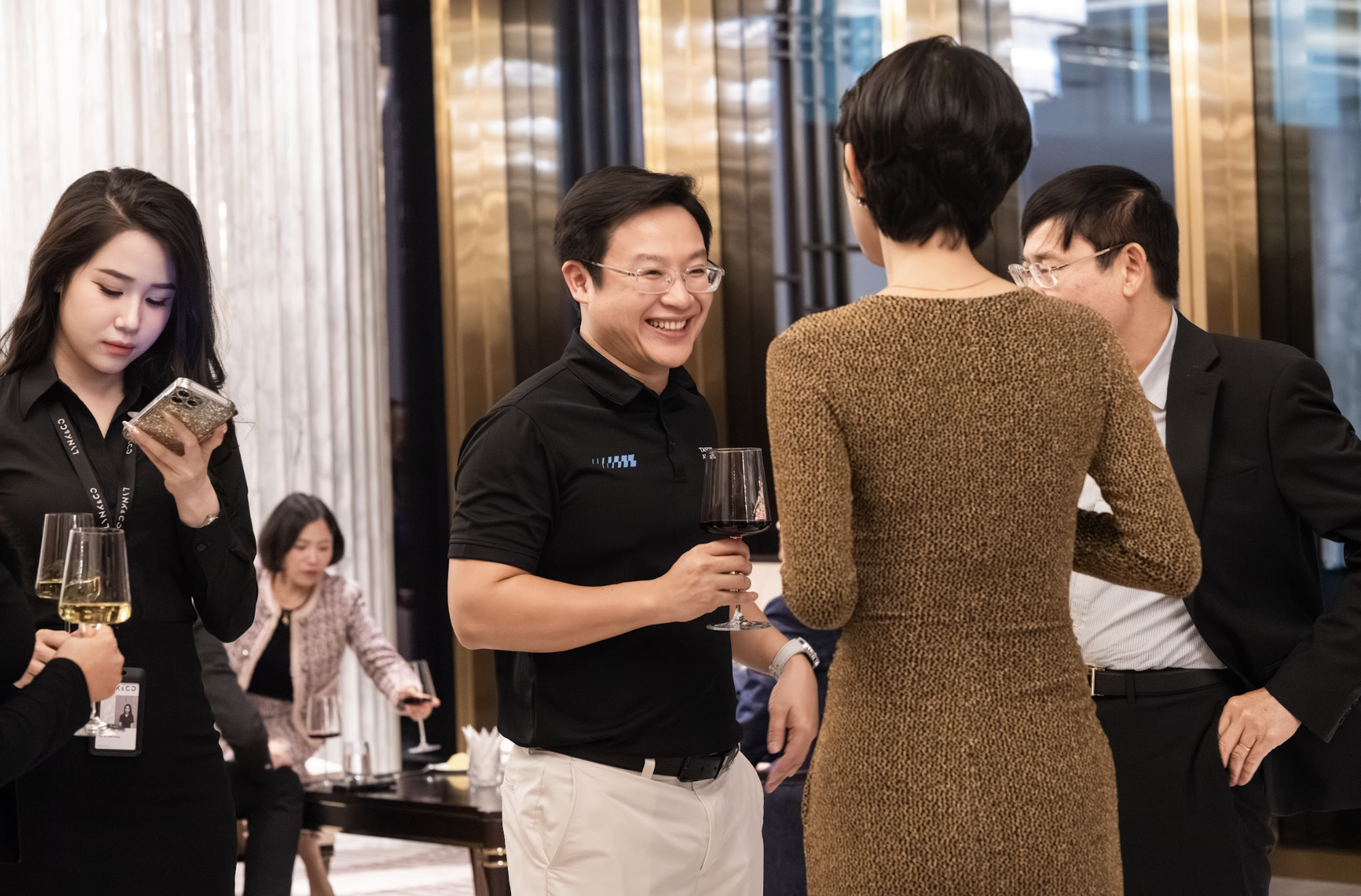Song hành cùng ẩm thực là không gian tiệc rượu được thiết kế tinh tế, nơi những ly vang, cocktail và đồ uống cao cấp trở thành chất xúc tác hoàn hảo cho các cuộc kết nối. Dưới ánh đèn vàng ấm, tiếng cụng ly vang lên nhẹ nhàng, không ồn ào, đủ để kéo gần khoảng cách giữa những người lần đầu gặp gỡ.
