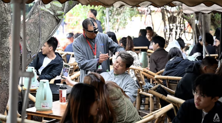 Thỉnh thoảng, cả khu lại vang lên âm thanh “ding” chói tai khi một người thợ ngoáy tai len giữa hàng ghế tre, cẩn thận phục vụ khách bằng những que tăm bông mềm gắn trên thanh kim loại mảnh. Dịch vụ độc đáo này trở thành một phần quen thuộc của đời sống nơi đây.