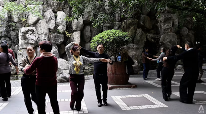 Nhóm cư dân lớn tuổi vui vẻ nhảy theo điệu nhạc. (Ảnh: CNA)