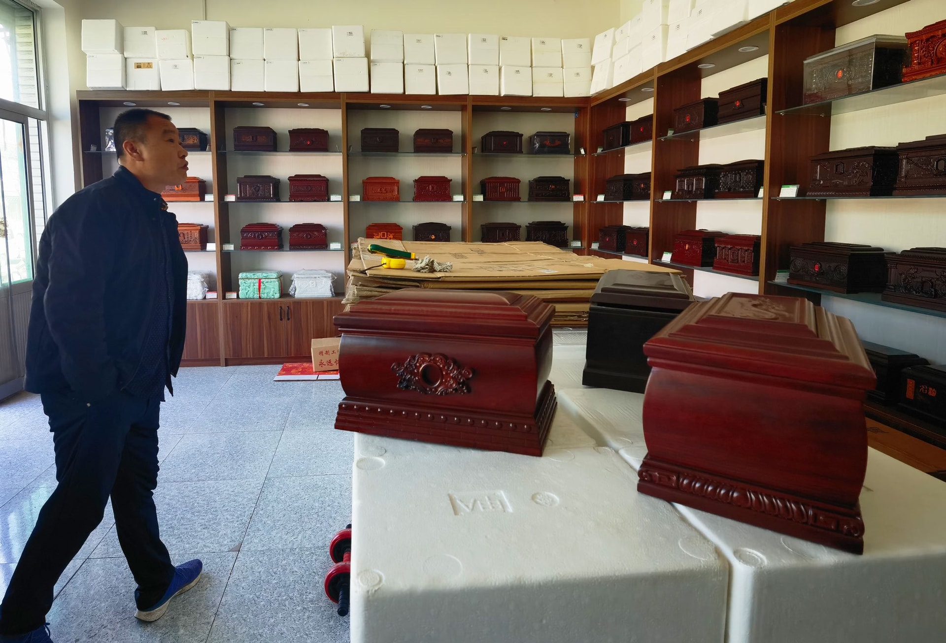 Các biển hiệu cửa hàng in đậm những cái tên như "Xưởng bán buôn túi đựng thi thể", "Phòng trưng bày quan tài gỗ lim" và "Hũ tro cốt pha lê cao cấp".