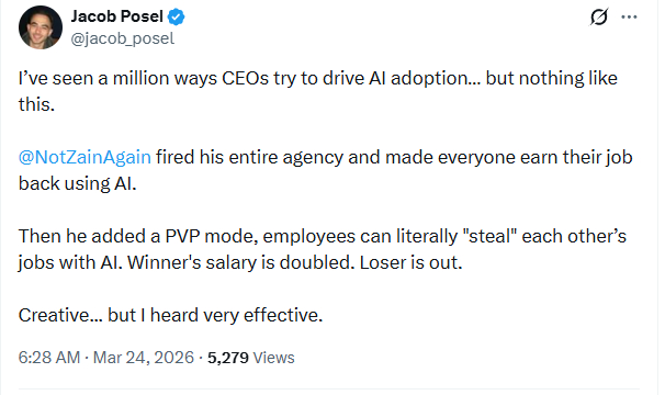 Gần đây, một bài đăng lan truyền trên mạng xã hội X đã thu hút sự chú ý khi mô tả một phương thức đặc biệt nhằm thúc đẩy việc áp dụng AI trong doanh nghiệp.