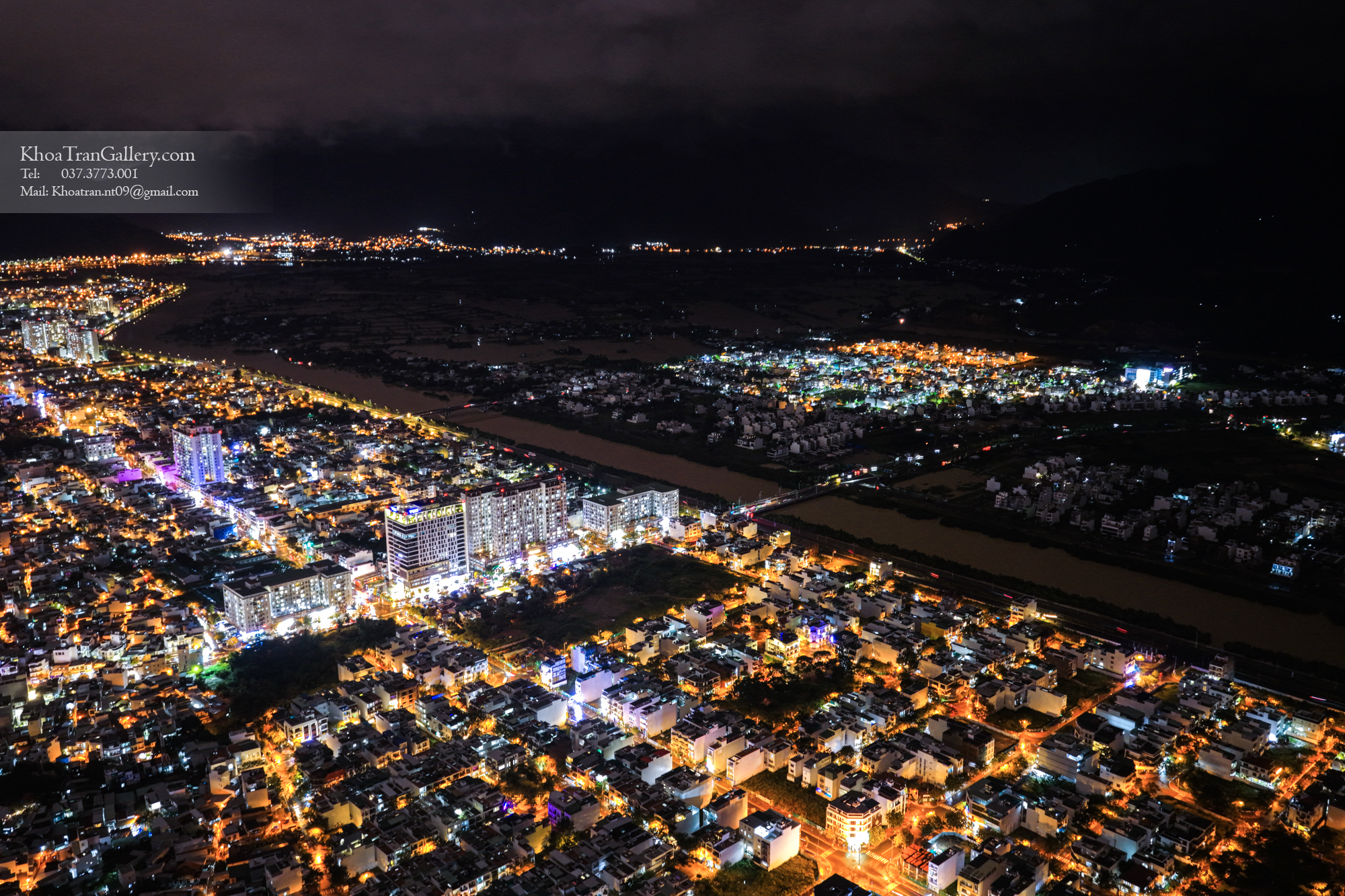 Từ trên cao, Nha Trang hiện lên như hai thành phố song song: một nửa sáng rực, một nửa chìm trong bóng tối mênh mông sau mưa lũ. Ảnh: Trần Anh Khoa