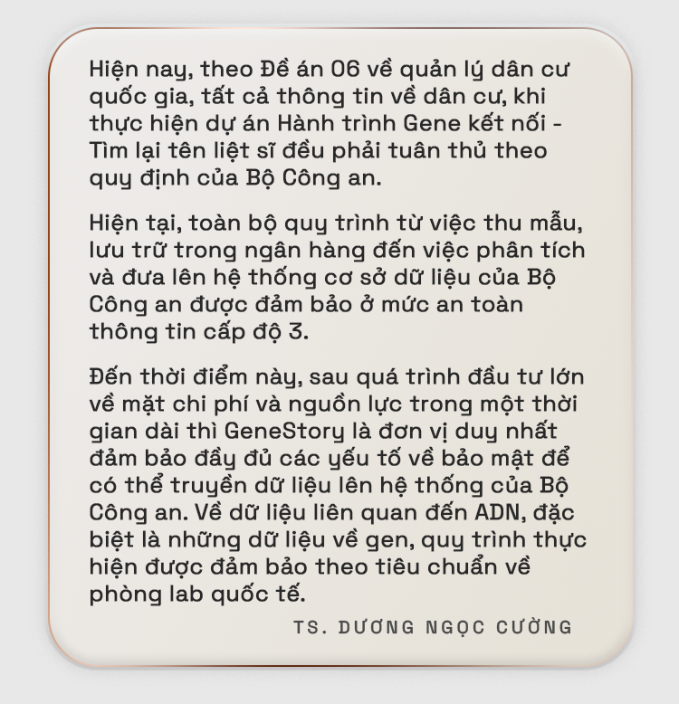 Kể từ đó đến nay là 15 tháng, cũng đã có rất nhiều công đoạn được triển khai. Nếu tính số lượng mẫu mà chúng tôi thu thập trong vòng 15 tháng vừa rồi cũng xấp xỉ bằng tổng số mẫu đã được thu thập từ cách đây hơn chục năm. Nhờ vào chủ trương của nhà nước và sự ủng hộ của các Bộ ban ngành, đặc biệt là Đề án 06 của chính phủ do Cục cảnh sát về quản lý hành chính và trật tự xã hội C06, Bộ Công an đứng ra chủ trì nên tất cả dữ liệu về dân cư được cập nhật lên hệ thống nên việc xác minh thông tin thân nhân đơn giản hơn rất nhiều.