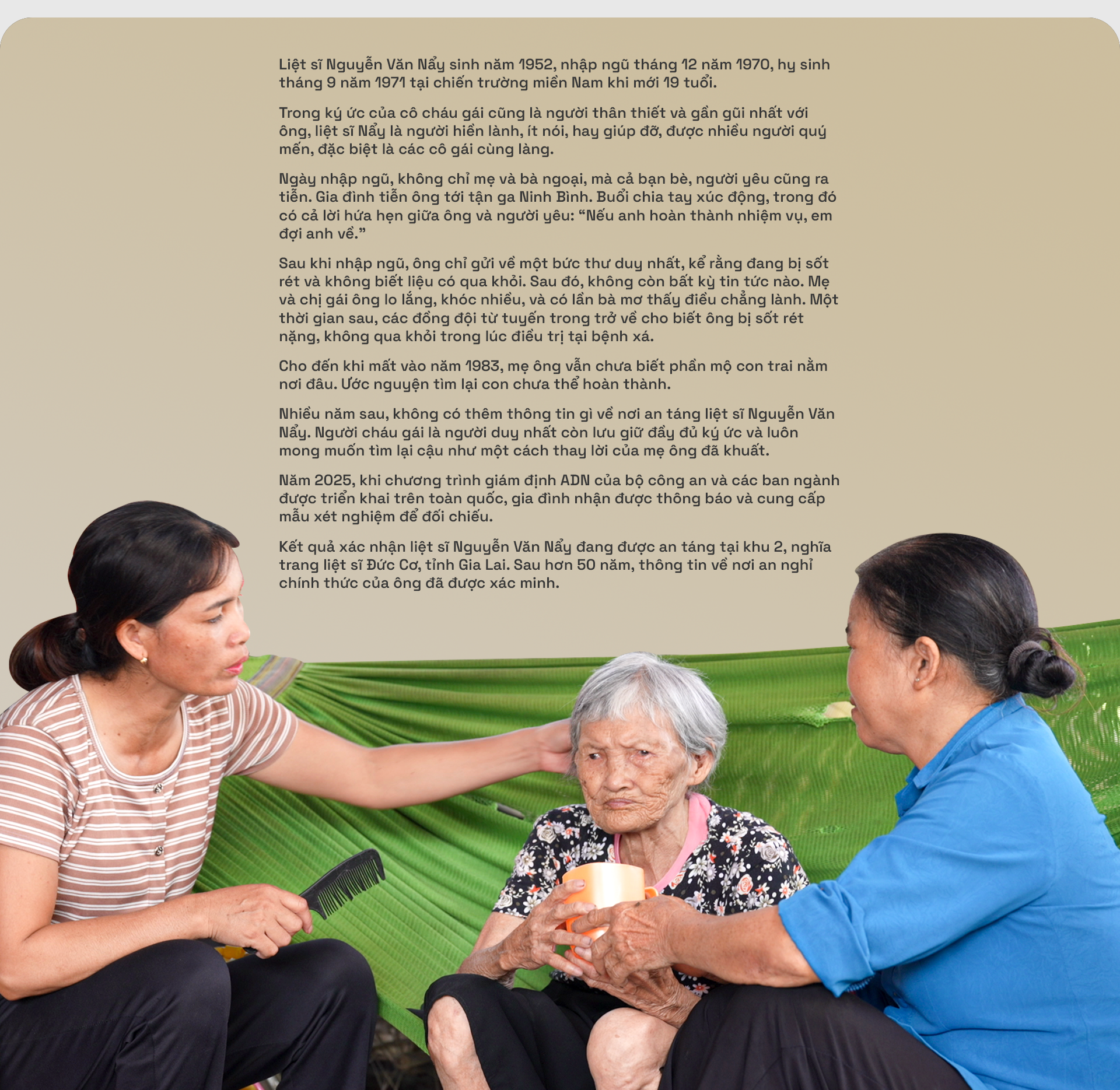 Khi những bàn tay run run chạm vào từng đoạn xương, từng mảnh vỡ nhỏ bé còn lưu giữ dấu tích của cuộc chiến… có những chiếc răng không còn nguyên vẹn, một khúc xương bàn chân vẫn nằm trong đôi dép nhựa cũ, hay những di vật giản dị mà các cô, các chú mang theo vào hang. Khoảnh khắc đó khiến mọi người không thể kìm được nước mắt. Bởi trước mắt không chỉ là hài cốt, mà là những số phận, những cuộc đời, những người đã ngã xuống để hôm nay chúng ta được sống trong hòa bình.