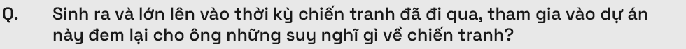 Từ khi còn nhỏ, những người lớn trong nhà cũng thường kể lại những ký ức ở chiến trường. Bác và bố tôi cũng là bộ đội Trường Sơn. Mặc dù không trải qua chiến tranh nhưng những câu chuyện đó cũng ảnh hưởng sâu sắc đến tôi. Sau này, lớn lên, đi học, đi làm, đi các nước, tôi thấy rằng cuộc chiến tranh bảo vệ Tổ quốc của ông cha vĩ đại quá! Dân tộc ta đã vững vàng được trong nhiều cuộc chiến thì chẳng có lý do gì lại khuất phục trước những khó khăn trong thời bình và thua kém bất cứ dân tộc nào trên thế giới.