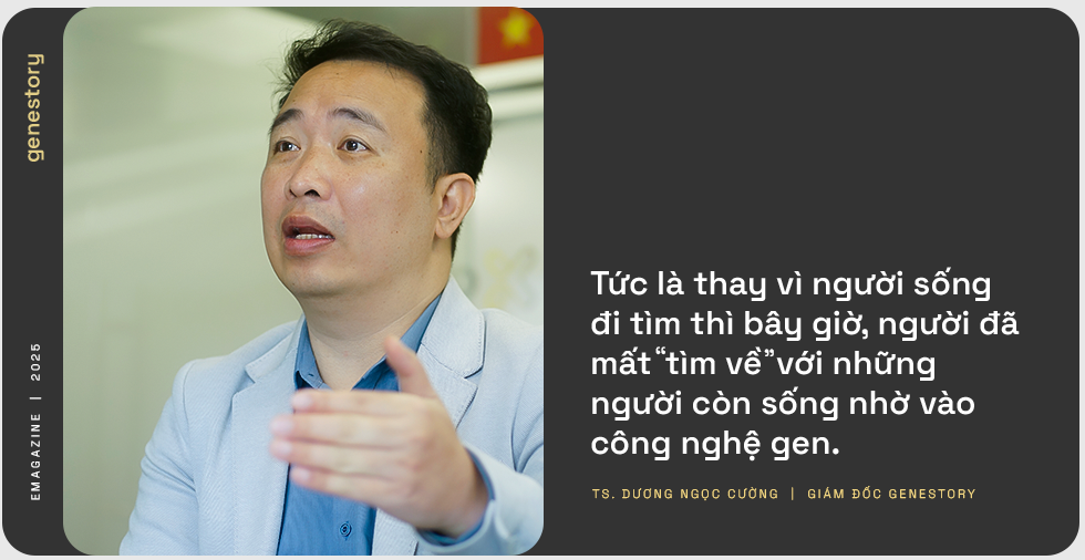 Chính vì thế, chúng tôi nghĩ rằng tất cả phải cùng chung tay vào làm được một Ngân hàng Gen của thân nhân - là những người đang còn sống có thể thu được mẫu, có thể xác định được ngay để lưu trữ lại mẫu gen. Sau đó, trong quá trình tìm kiếm, thu thập hài cốt, ta có thể dùng những mẫu ADN từ hài cốt đối sánh lại với thông tin của nhân thân thì hiệu quả hơn rất nhiều. Tức là thay vì người sống đi tìm thì bây giờ, người đã mất "tìm về" với những người còn sống nhờ vào công nghệ gen.