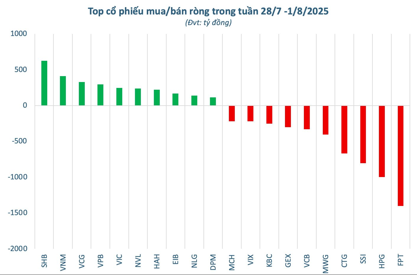 Thống kê theo các mã chứng khoán, trong tuần giao dịch vừa qua, khối ngoại tiếp tục xu hướng mua ròng tại nhiều cổ phiếu ngân hàng, bất động sản và nhóm vốn hóa lớn. Dẫn đầu chiều mua ròng là SHB với giá trị 623 tỷ đồng, theo sau là VNM (412 tỷ đồng) và VCG (328 tỷ đồng). Lực cầu từ khối ngoại cũng tập trung tại các mã VPB (297 tỷ đồng), VIC (245 tỷ đồng) và NVL (236 tỷ đồng). Ngoài ra, các cổ phiếu như HAH, EIB, NLG, DPM, SHS và HDC cũng ghi nhận giao dịch mua ròng tích cực trong tuần.