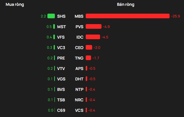 Chiều ngược lại, MBS là mã chịu áp lực bán ròng của khối ngoại với giá trị gần 26 tỷ đồng; theo sau PVS bị bán 5 tỷ, IDC, CEO, TNG bị bán từ vài tỷ đồng.