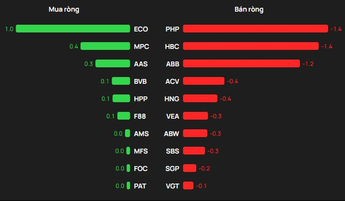 Chiều mua, cổ phiếu ECO được khối ngoại mua 1 tỷ đồng. Theo sau, MPC và AAS cũng được mua ròng mỗi mã vài tỷ đồng.