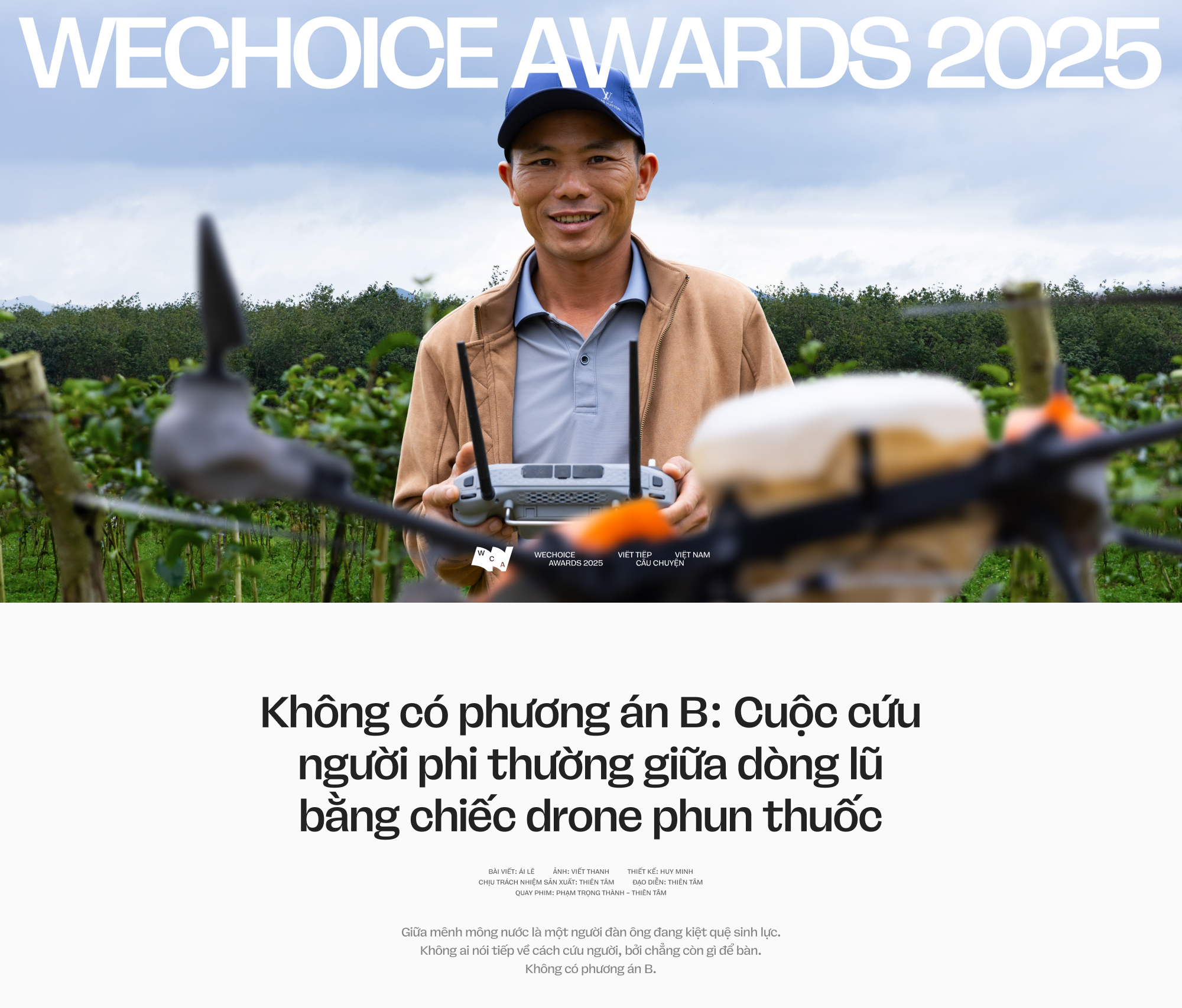 Anh Thiện nói không biết Trường có nhìn thấy dòng chữ đó hay không. Nhưng anh Trường đã buộc được dây, đã trèo lên và đu mình vào drone. Drone bay lên. Người đàn ông rời khỏi mặt nước. Lơ lửng giữa trời, cách dòng lũ khoảng 10 mét. Khoảnh khắc ấy, anh Thiện đã bước thêm một bước liều mạng so với dự tính ban đầu.