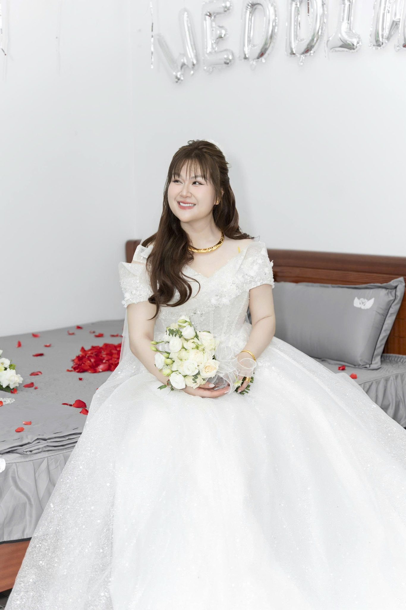 Trong loạt ảnh cưới năm ngoái, cô khiến nhiều người bất ngờ bởi vẻ ngoài tươi tắn và rạng rỡ hơn hẳn so với hình ảnh trên màn ảnh ngày nào. Diện váy cưới trắng bồng bềnh với phần tay phồng nhẹ và lớp vải phủ lấp lánh, Thuỷ Tiên gây ấn tượng khi các đường nét trở nên hài hoà và thanh tú hơn. Thiết kế cổ chữ V vừa đủ tinh tế giúp gương mặt thêm thanh thoát, trong khi mái tóc dài uốn nhẹ, buông mềm mại quanh vai càng tôn lên nét nữ tính.