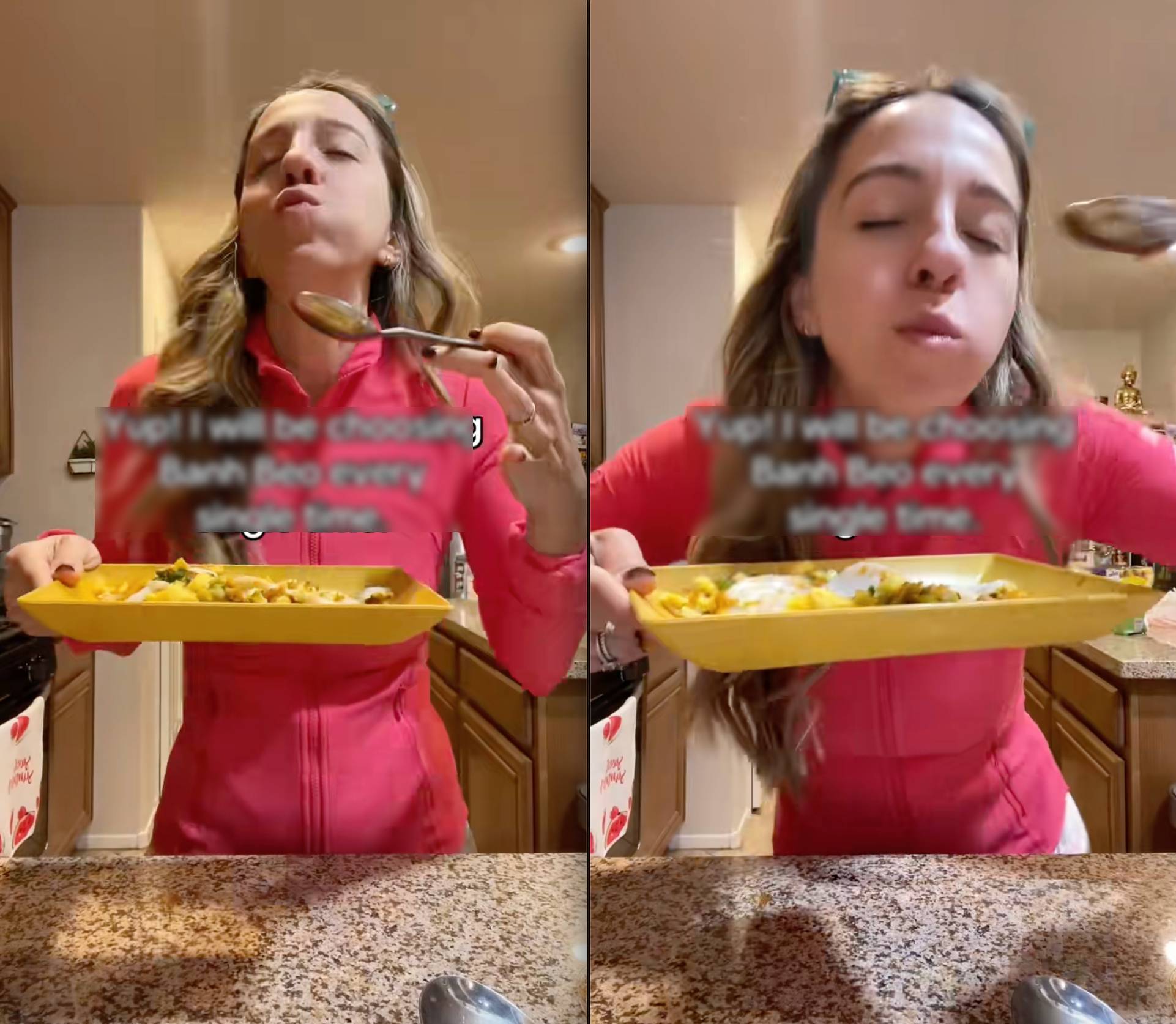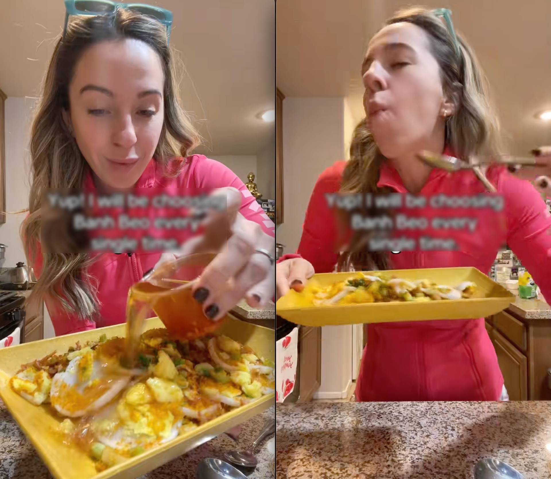 Trong đoạn video đang lan truyền, một cô gái Tây đứng trước bàn ăn với đĩa bánh bèo vô cùng hấp dẫn. Cô cầm muỗng xúc từng miếng bánh trắng mịn cùng tôm chấy, nước mắm, rồi đưa lên miệng với vẻ đầy hào hứng. Điều khiến người xem chú ý không phải chỉ là cách cô ăn, mà là phản ứng sau đó: vừa nhai, cô vừa nhún nhảy theo nhịp, lắc lư người liên tục, gương mặt hiện rõ sự thích thú và hạnh phúc.