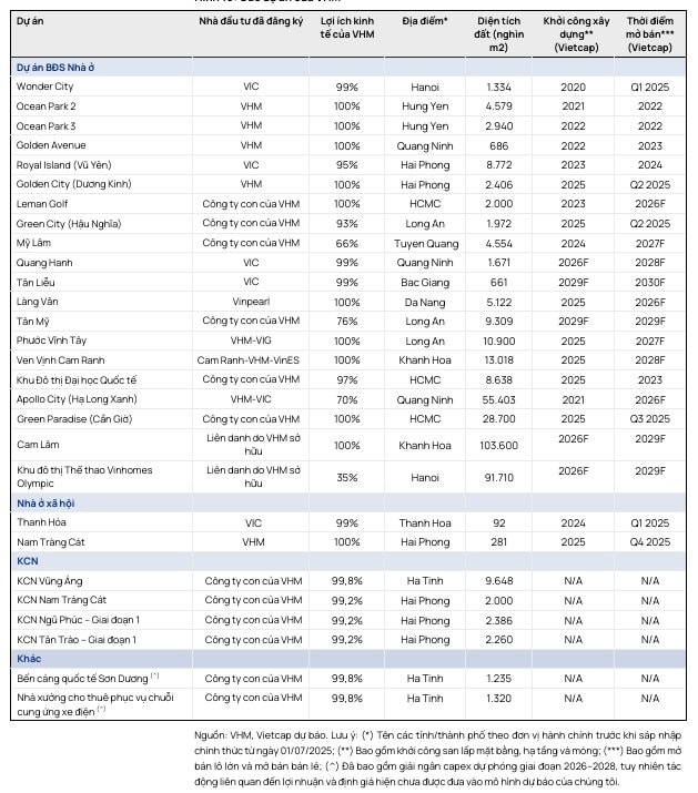 Theo Vietcap, Tập đoàn Vingroup trực tiếp đứng tên chủ đầu tư tại các dự án trọng điểm phía Bắc gồm Vinhomes Wonder Park tại Hà Nội, Vinhomes Royal Island tại Hải Phòng, Vinhomes Quang Hanh tại Quảng Ninh và Vinhomes Tân Liễu tại Bắc Giang. Tại các quỹ đất này, Vingroup duy trì tỷ lệ lợi ích kinh tế chi phối từ 95% đến 99%.