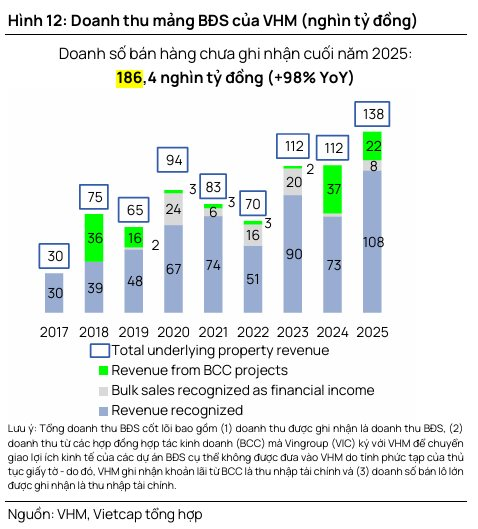 Theo Vietcap, tổng giá trị hợp đồng bất động sản đã ký nhưng chưa bàn giao (backlog) của VHM đạt mức 186.400 tỷ đồng tính đến cuối năm 2025